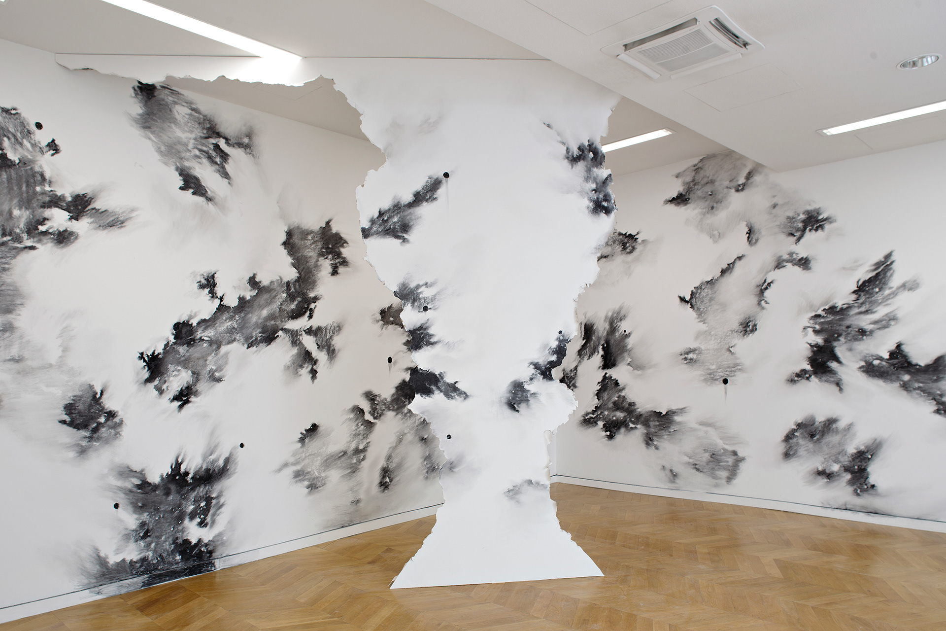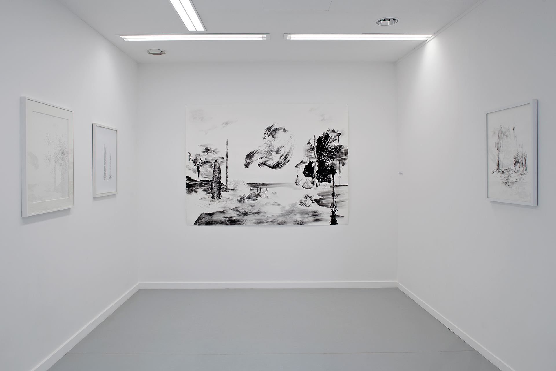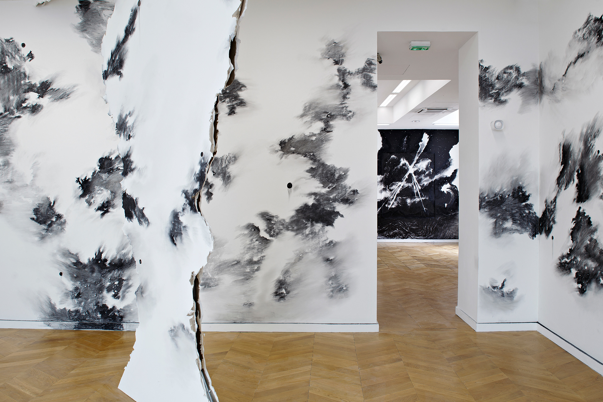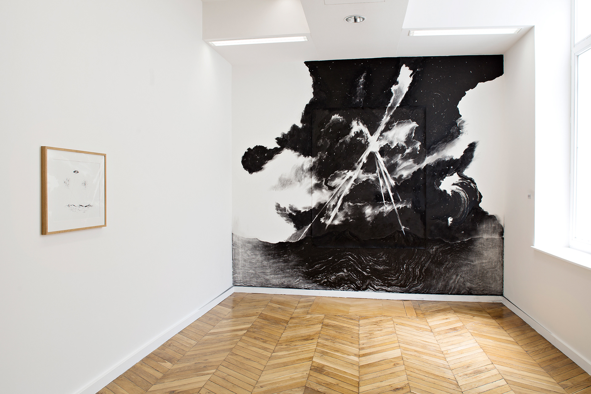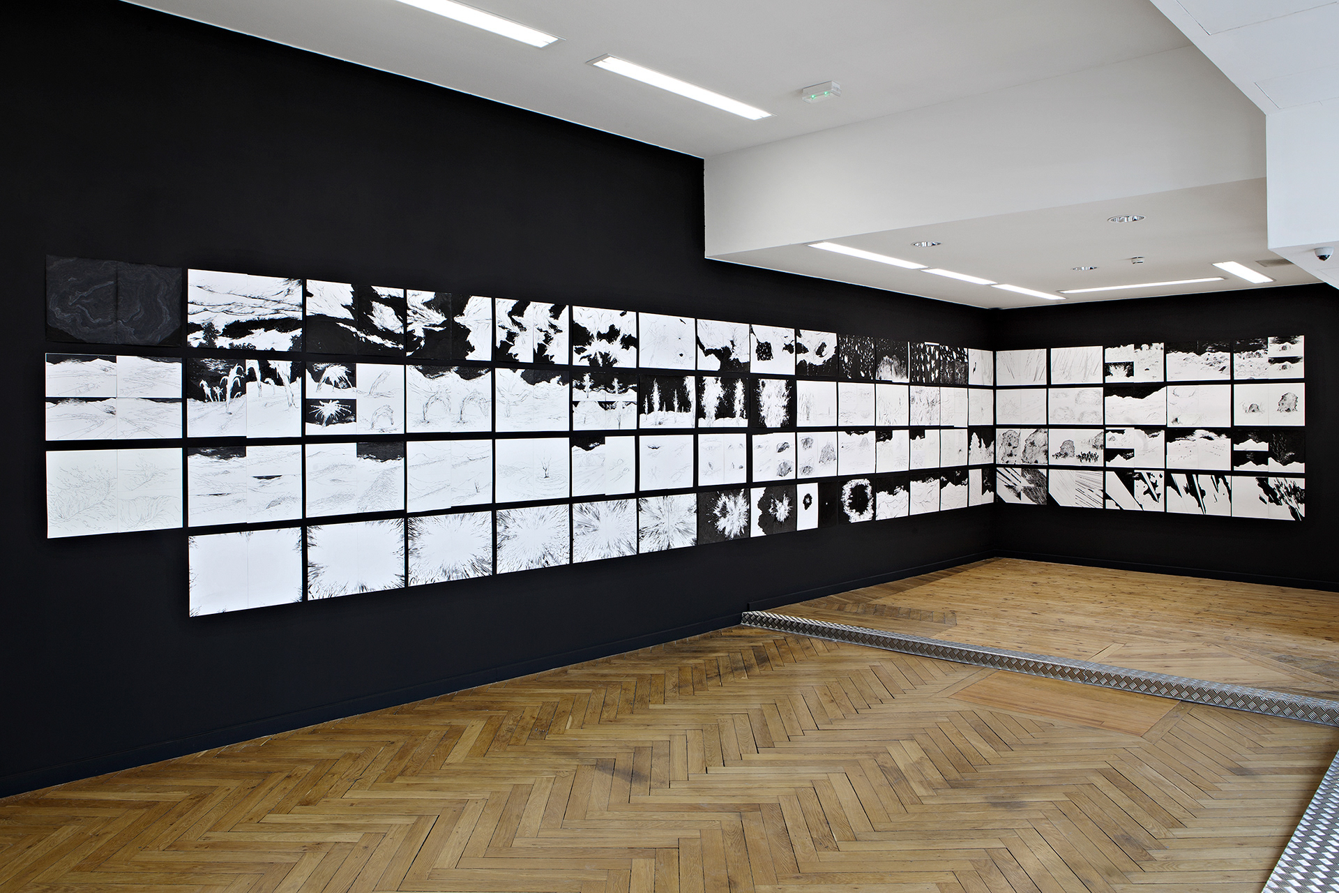 Noir. Les cieux tumultueux ouvrent le noir, découpent les silhouettes d’arbres et d’arbustes pris en contre-jour. Dans un mouvement ascensionnel, des nuages immaculés mutent, s’épaississent jusqu’à atteindre la compacité visqueuse de vastes nébuleuses froides et brûlantes, gazeuses et magmatiques – une matière inconnue, blanche mais noire, non pas détachée du noir intense mais laissée en réserve : le blanc est toujours le trou, le noir n’est jamais le vide. Les dessins sont des inversions, le noir enveloppe le blanc du papier, le dessin est une construction mentale d’espaces inversés, le blanc n’existe que cerné par le noir, le blanc du papier est le motif survivant au noir, le blanc est le trou voué à la révélation des trous noirs.
