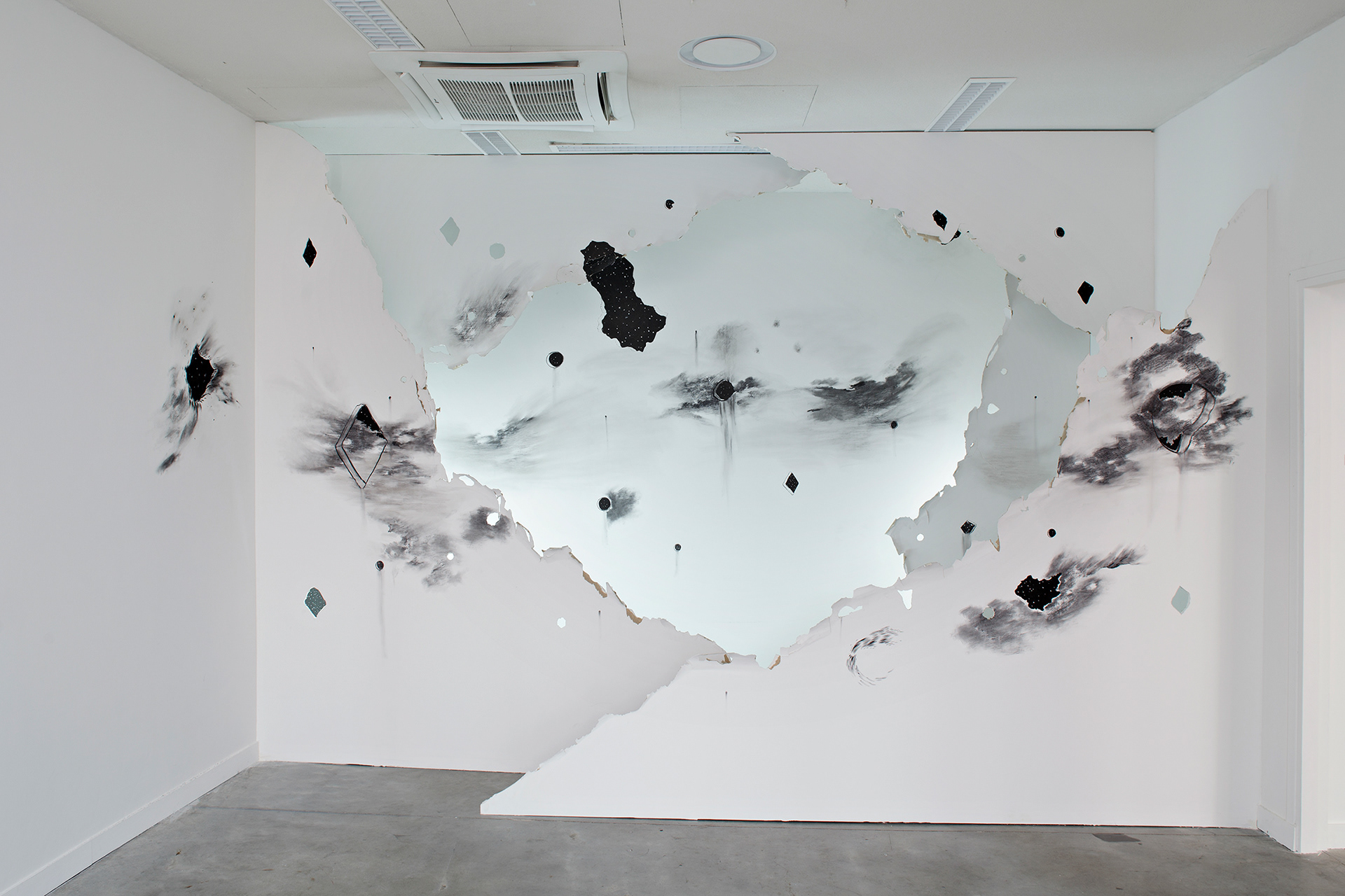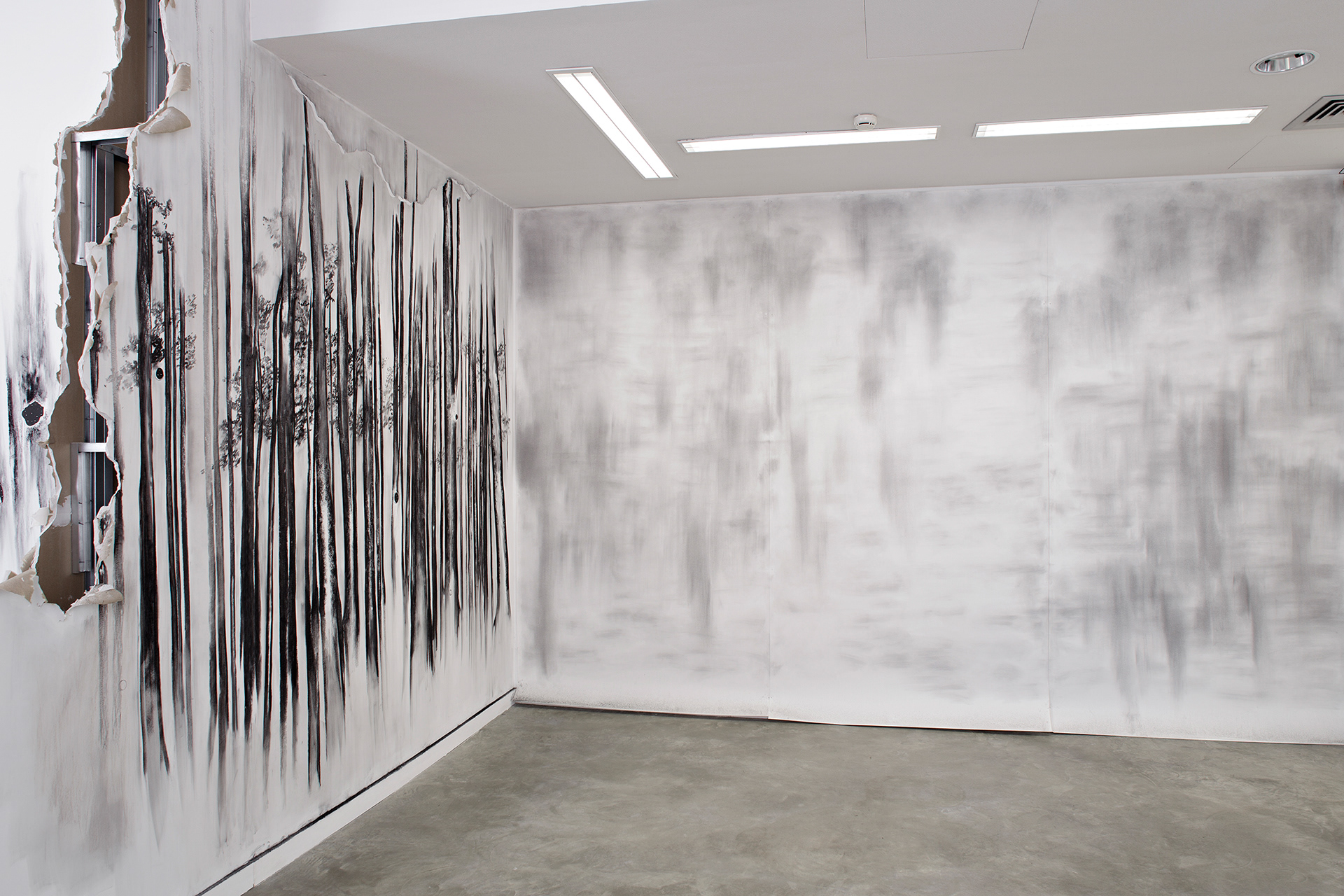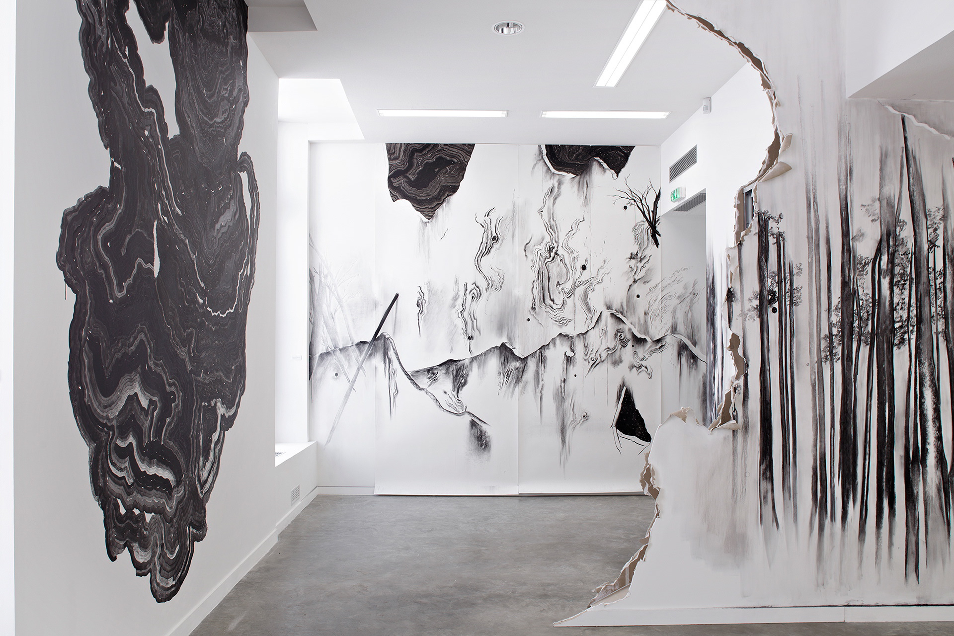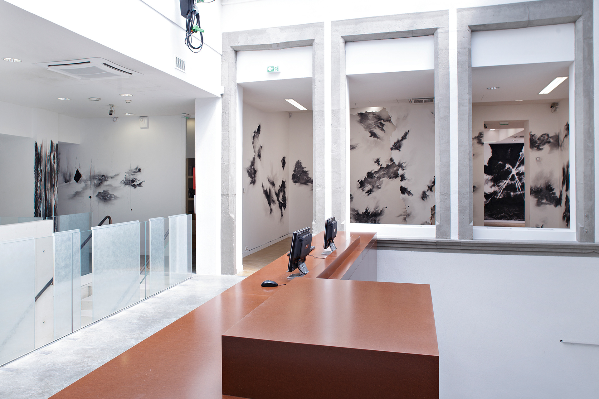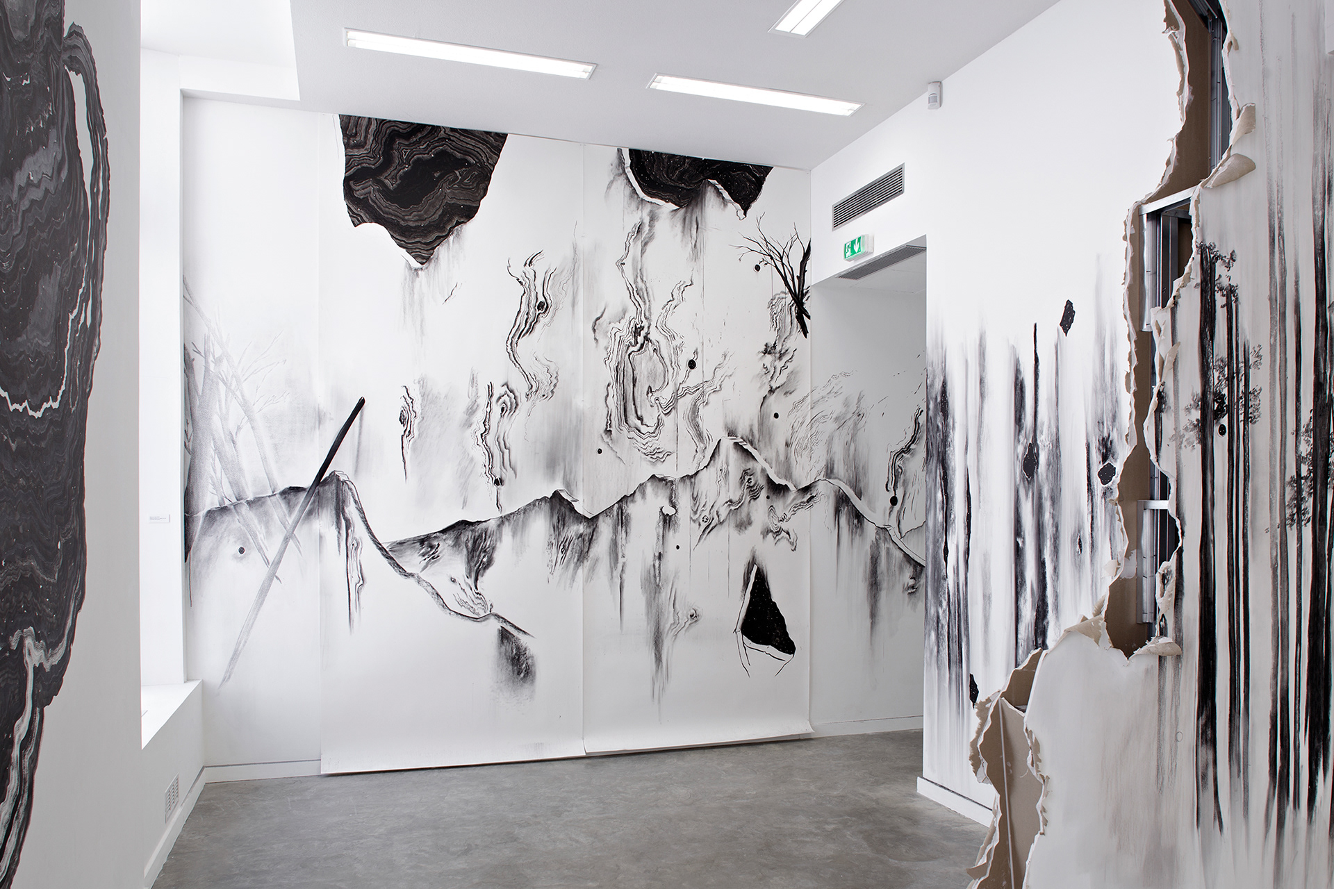 Noir. Les cieux tumultueux ouvrent le noir, découpent les silhouettes d’arbres et d’arbustes pris en contre-jour. Dans un mouvement ascensionnel, des nuages immaculés mutent, s’épaississent jusqu’à atteindre la compacité visqueuse de vastes nébuleuses froides et brûlantes, gazeuses et magmatiques – une matière inconnue, blanche mais noire, non pas détachée du noir intense mais laissée en réserve : le blanc est toujours le trou, le noir n’est jamais le vide. Les dessins sont des inversions, le noir enveloppe le blanc du papier, le dessin est une construction mentale d’espaces inversés, le blanc n’existe que cerné par le noir, le blanc du papier est le motif survivant au noir, le blanc est le trou voué à la révélation des trous noirs.