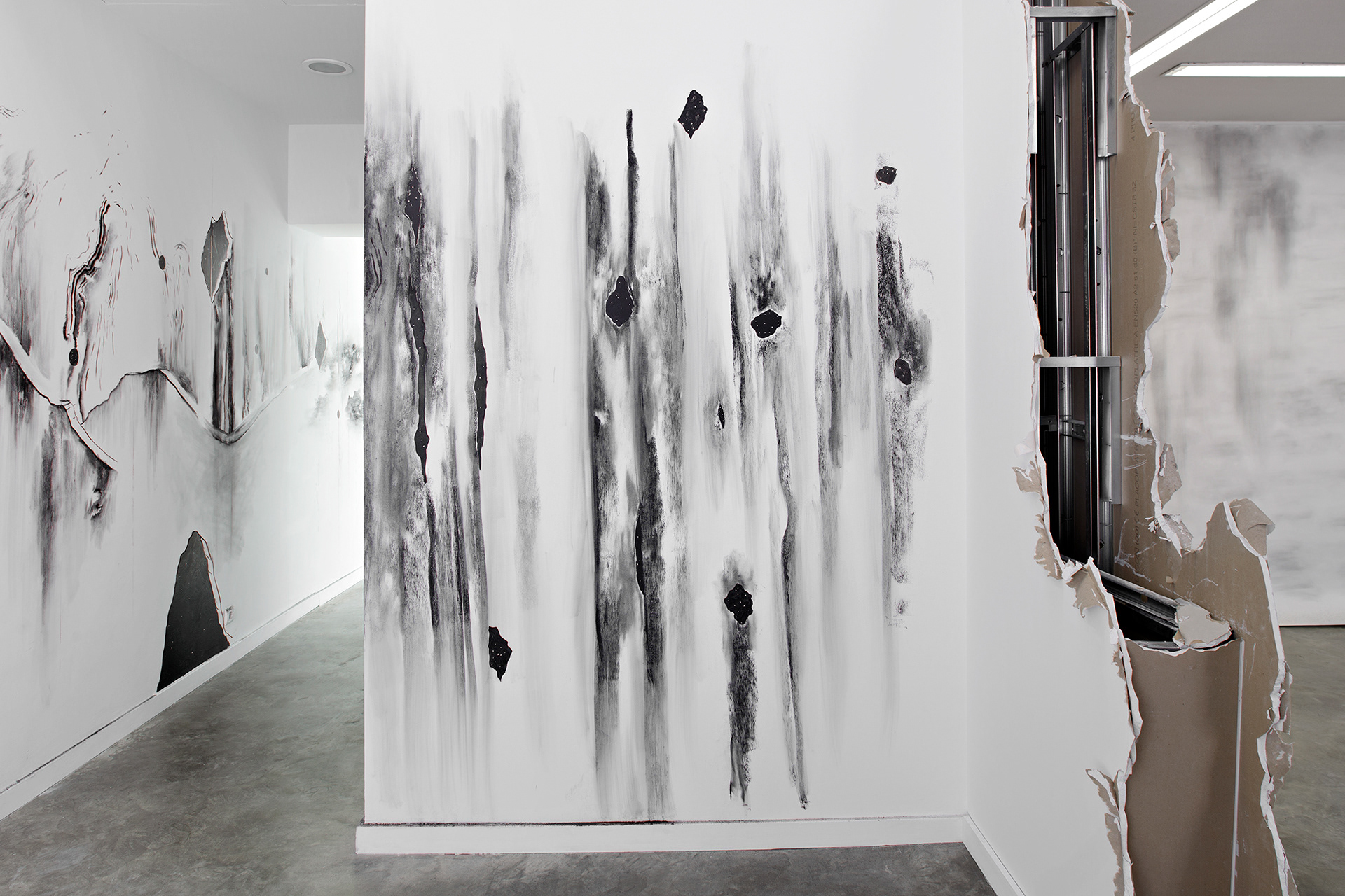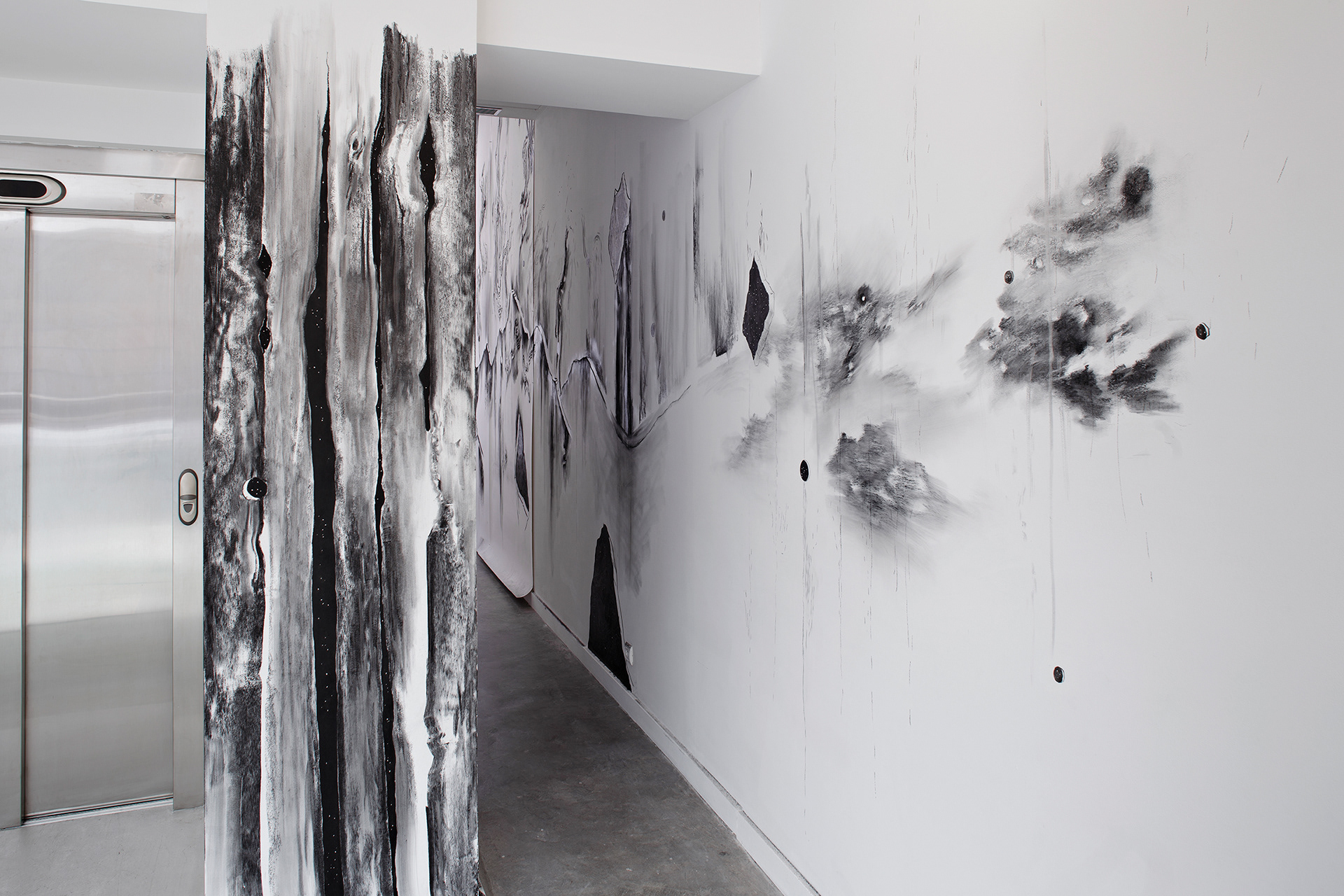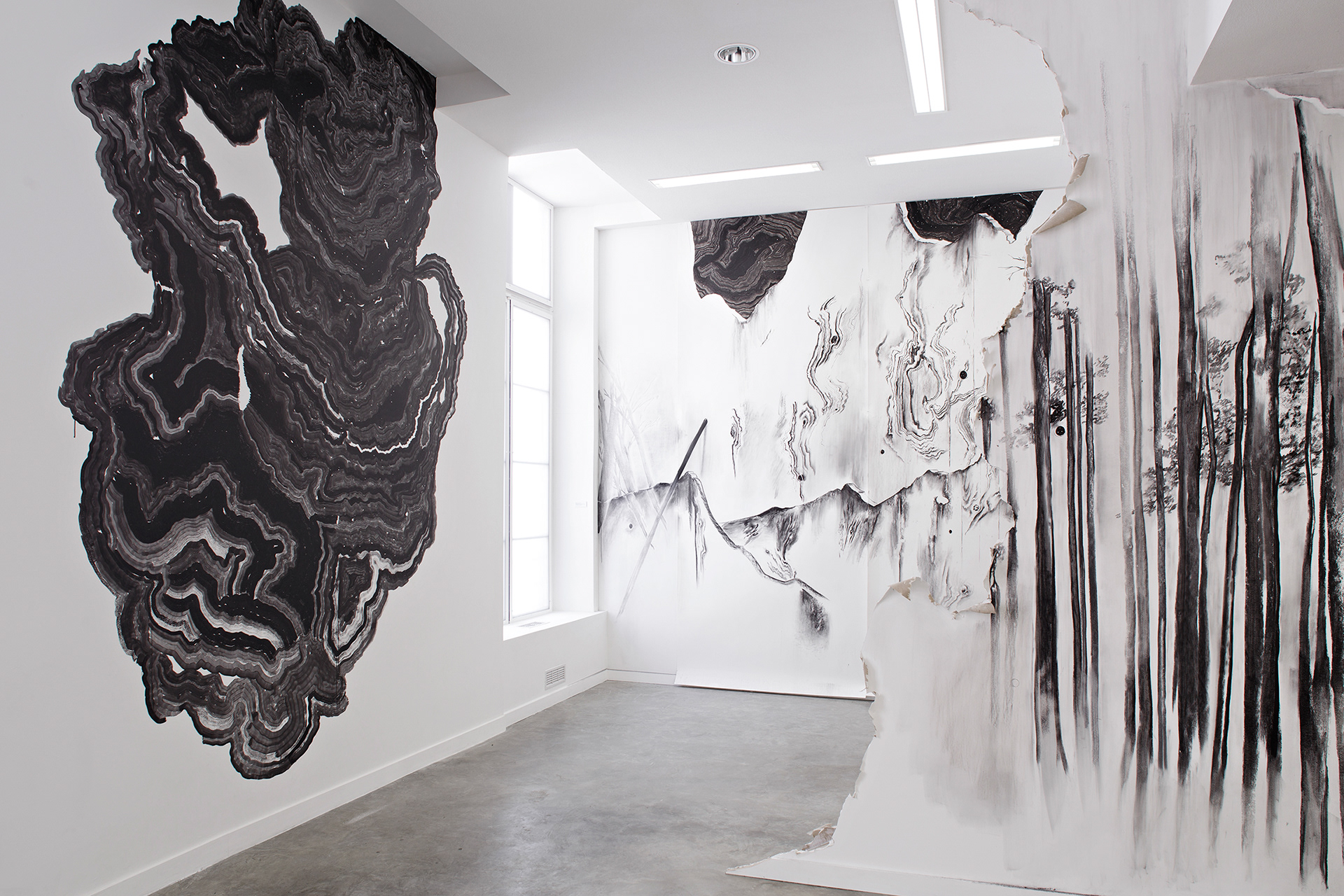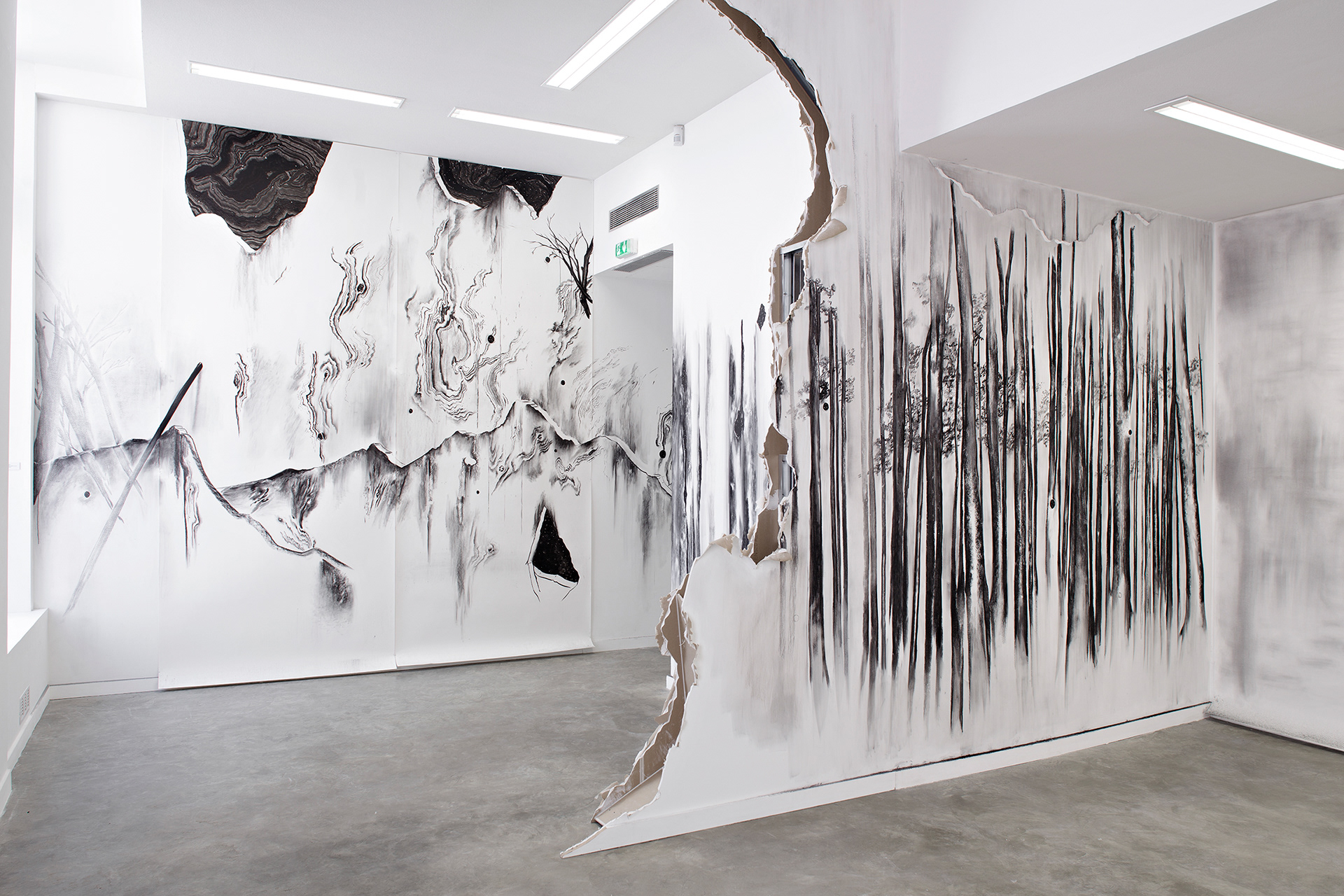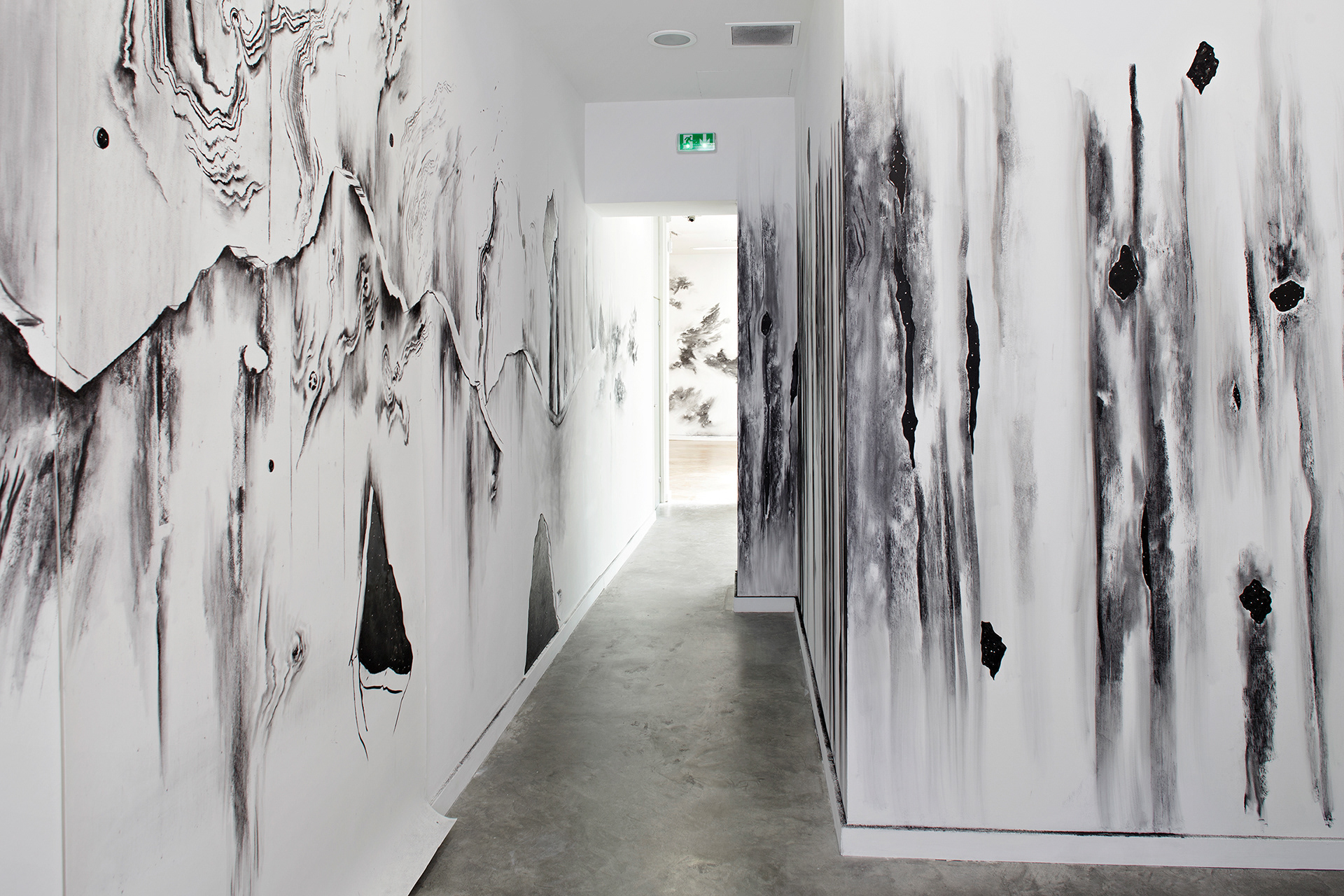 Noir. Les cieux tumultueux ouvrent le noir, découpent les silhouettes d’arbres et d’arbustes pris en contre-jour. Dans un mouvement ascensionnel, des nuages immaculés mutent, s’épaississent jusqu’à atteindre la compacité visqueuse de vastes nébuleuses froides et brûlantes, gazeuses et magmatiques – une matière inconnue, blanche mais noire, non pas détachée du noir intense mais laissée en réserve : le blanc est toujours le trou, le noir n’est jamais le vide. Les dessins sont des inversions, le noir enveloppe le blanc du papier, le dessin est une construction mentale d’espaces inversés, le blanc n’existe que cerné par le noir, le blanc du papier est le motif survivant au noir, le blanc est le trou voué à la révélation des trous noirs.