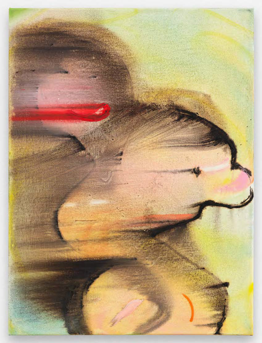 The works of Aneta Kajzer are characterized by successive states of saturation / clarification, heaviness / delicacy, appearance / disappearance and moreover combine figuration and abstraction, maintained in a state of tension so that neither one prevails over the other. This co-existence is not a compromise but rather a standpoint, a means of inhabiting painting while it still thinks for itself. For the artist, the distinction between abstraction and figuration is irrelevant, stemming from an outdated notion of division, inherited from an era when it was still considered that painting had to choose between the real world and itself. She situates herself in the aftermath of this period, in an epoch where form and flow, silhouettes and smudges belong in the same continuum. In Aneta Kajzer’s practice, the visible and the sensory intermingle, color gives rise to form in the same manner that sound gives rise to resonance and her painting is thus a realm of a constant flow between what is revealed and what has melted away. Aneta Kajzer’s painting borrows as much from the liberty of Helen Frankenthaler’s washes and fields of color as it does from the figurative work of Maria Lassnig, Miriam Cahn and Nicole Eisenman, who are all true heroines to her. It’s not a question of abstraction succeeding figuration or vice versa: it is their shared vitality that gives birth to the painting. A flowing brushstroke becomes a lock of hair; a brown drip melts into a curtain of rain: two black dots open up into eyes; spilled cadmium takes the form of a mouth; the swipe of a metal paint-tube carves out the line that was missing in a pencil-less drawing. This economy is allied to a luxuriance that barely blossoms before fading away. Aneta Kajzer’s characters all have their moods—solemnity, a faint smile, tenderness—yet they accept that they are only hypothetical, and are beings that exist simply by chance. But isn’t that ultimately a characteristic of our own common destinies? Icarus is never far away, a symbol of fragile flight towards light that always ends up by being consumed.