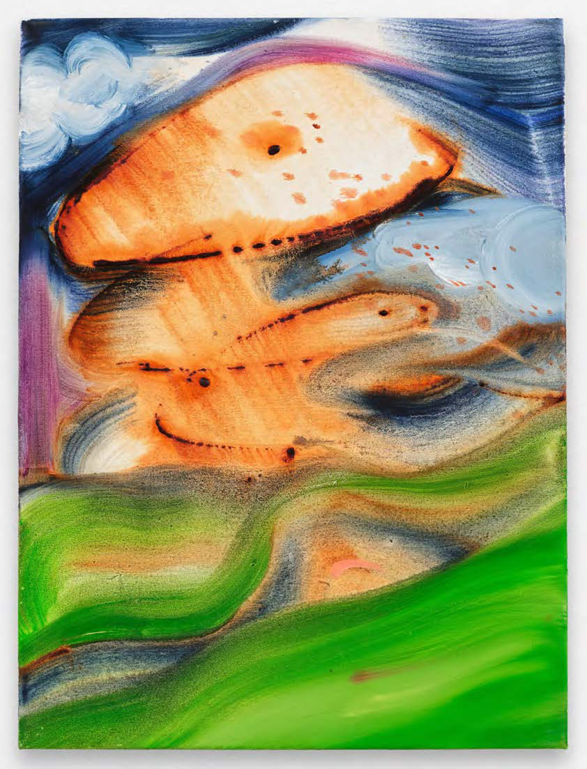 Le plaisir de peindre est manifeste dans une intensité jouissive, dans la diversité des viscosités – huile diluée ou veloutée, aquarelle turbulente –, dans les traînées qui deviennent des cheveux ou un vent. Chaque geste est un événement tactile et chimique avant d’être un contour, tenu par une légèreté et une capacité à signifier et à se rétracter, à faire signe et aussitôt à redevenir pure matière. Ce qui apparaît peut aussitôt se dédire, reprendre souffle et circuler. Cette légèreté n’exclut pas l’orage : dans Aus dem Paradies vertrieben (« Chassés du Paradis »), le sombre pourpre mêlé de brun rouillé annonce la tourmente ; les rouges vinyle et les mauves se nouent en tunnels ; les violets pivotent comme des couloirs organiques ; un bulbe rose s’ouvre, hésitant entre soleil intérieur et joue gonflée ; la représentation pulse et se rétracte comme si le motif avait été chassé de lui-même, expulsé par la poussée des flux. Les œuvres récentes serrent de plus près une gamme rouille-camaïeu oxydée comme un métal exposé trop longtemps, en friction avec les pastels lumineux (jaunes acides, bleus lactés, roses de lait) : trop près du soleil, les couleurs s’échauffent, se caramélisent puis se clarifient en une bruine de lumière. Par endroits, la couleur se détache de toute modulation pour atteindre un état de pure intensité surpassant la stridence ou la brûlure pour atteindre la netteté souveraine d’un ton qui s’affirme seul – rose pur, bleu franc, jaune à la limite de l’immatériel... Ces aplats, d’une limpidité presque naïve, ouvrent des clairières dans la densité du tableau ; ils agissent comme des respirations optiques, des zones où la peinture semble suspendre son tumulte pour se regarder exister.