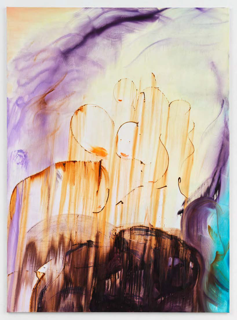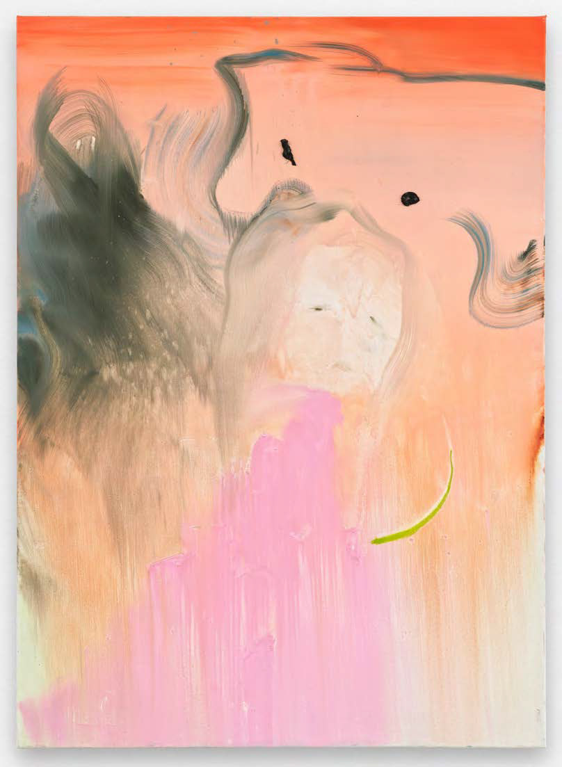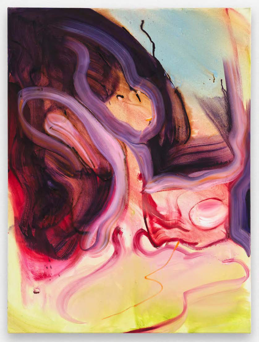 The sheer pleasure taken in painting is evident through its almost ecstatic intensity and in the interplay of differing textures and viscosities—diluted or velvety oils, more turbulent watercolors—in the streaks that become hair or wind. Each gesture starts out as a tactile or chemical event before taking form as a contour sustained by its lightness and capacity to signify and then withdraw—to create a figure and almost immediately return to pure matter. The painting Slippery Slope is one of the most explicit examples of this shift, with its flowing orchid pinks, its suspended deep blue, the pale yellows that seem to evaporate from the surface and a violet inflection that barely hints at a profile. The painting does not simply advance toward the viewer, it cascades downwards, its adherence shifting through an accumulation of frictions. What might appear can also rapidly retract, catch its breath and move on. This feathery lightness does not exclude storms: in Aus dem Paradies Vertrieben (Expelled from Paradise), the deep purple mixed with rusty brown announces the oncoming turbulence; blood reds and mauves knot together to form tunnels; violets contort into organic passageways; a pink bulb opens out, undecided whether it’s an inner sun or a puffed-out cheek; the representation itself pulses and retracts as if the motif had been expelled from itself by its own inner currents. Aneta Kajzer’s more recent works find their focus in a rusty oxidized palette reminiscent of corroded metal that has been left exposed too long, as well as contrasting bright pastels (acid yellow, milky blue and powder pink): When they get too close to the sun, the colors intensify and become almost caramelized, finally clarifying into a mist of light. Venturing too close, taking the risk of being incinerated, is the natural fate of paintings where accidents are a veritable aspect of the painter’s methodology, where the unexpected is a given, where the works are born at their inception, without preparatory sketching, through reversals, erasures and fresh beginnings. In places the colors detach themselves from any tonal nuance to reach a state of pure intensity that surpasses stridency or any scorched effect to attain an absolute clarity of a tone that asserts itself alone: Pure pink, true blue or yellow verging on the immaterial. These flat tints, with their almost naïve clarity open up clearings in the density of the canvas; they function as optical breathing spaces, areas where the tumult of the painting seems to be suspended, in order for it to view its own existence.
