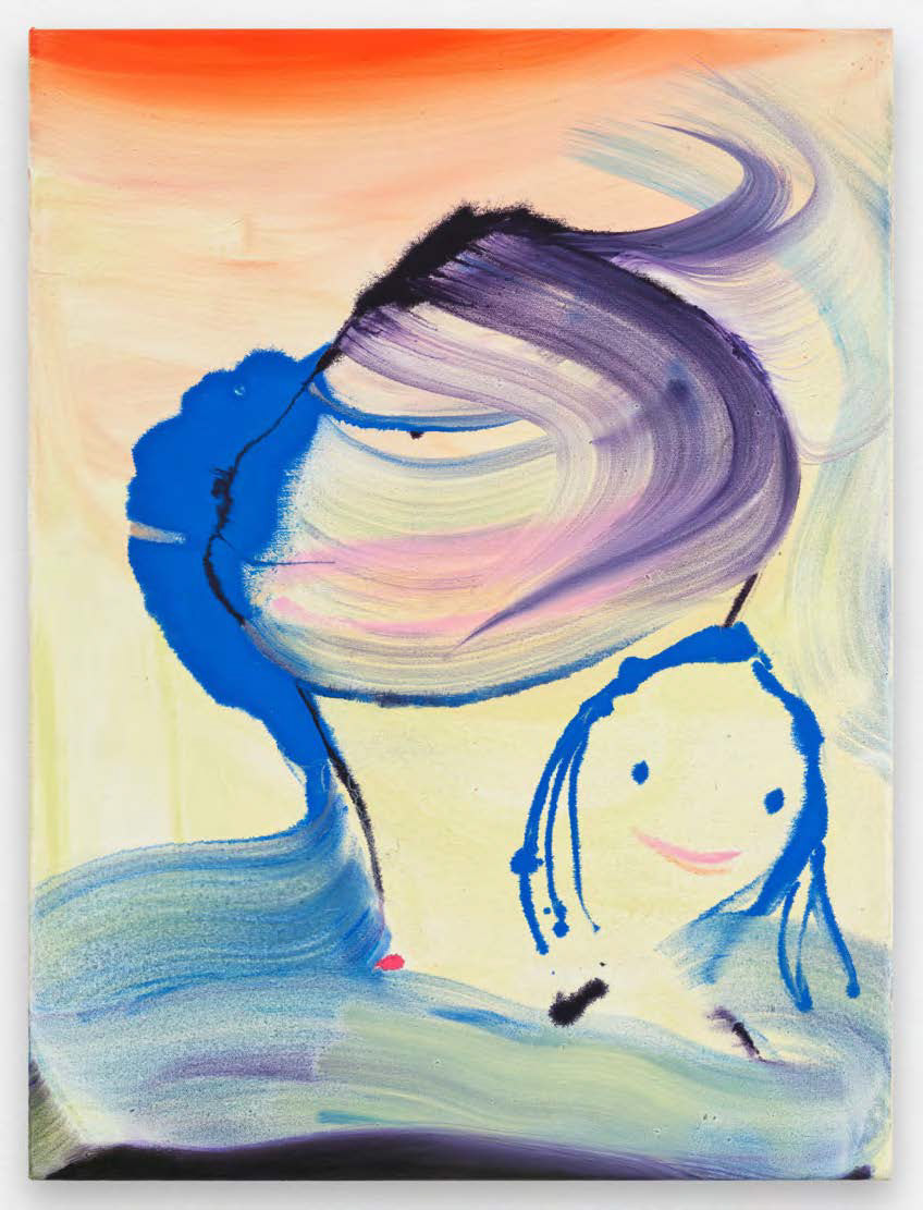 Aneta Kajzer’s sun is not an astral body: It is a flood of paint, a furnace that dilates and dissolves forms, bathing them in burning color as if, when brought close to their flash-point, these colors might gain an extra degree of freedom. In some cases, this chromatic stridency attains an almost electric intensity: the acidic pinks, the lemon yellows and fluorescent greens generating their own light and the energy-saturated surfaces becoming sun screens. These areas of over-exposure provoke dissonance, summoning a collision of contrasts that quiver to the point of irreconcilability and stretch harmony to the brink of rupture. In these almost overly-luminous instances, it is as if Aneta Kajzer were exploring a territory where painting is accomplished at the risk of being scorched in order to achieve more clarity. “Too Close to the Sun” lays bare that precise instant when painting takes the form of a kind of unstable meteorology, a critical point beyond which wind-swept brushstrokes, downpours of pigments, flashes of red-orange oxidation, misty pastels and cool, shadowy layers are unable to hold their place in the atmosphere and are condemned to an inexorable fall. Nothing is planned in advance: forms emerge in the painterly flow, guided by interactions between materials, by the fragile balance between the painter’s gestures and the withdrawal of her brush. Aneta Kajzer’s painting is comprised of vigilance and attention, a practice that lies in wait for its own revelations. Her figures never appear due to premeditated decisions, but as slowly formed apparitions, born of the climate of each work. They emerge from the colors as if from a nebulous haze, a stroke of controlled luck, a run interrupted at just the right moment, a smear that suddenly acquires meaning in a melancholic flurry, or on the contrary, in a slightly insolent or humorous pirouette. The various figures can be sensed before being fully recognized, like a face glimpsed in a cloud or reflected in water; discovered rather than invented. In the same way as when a cloud-watcher perceives a head, a profile or an animal, the artist hunts down fleeting resemblances and lets pareidolia reveal the scene: a brush-stroke, a swollen drop or a metallic scratch etched with the edge of the paint-tube might all contribute to the sketching out of the outline of a face, then, in the instant that follows, vanish into the abstraction of an evanescent figure. In the painting Doppelgänger, the mass of ultramarine blue transforms into hair, a child’s, smiley-like face is overshadowed by a second, almost menacing figure, composed of a broad purple stroke curving through the space of the canvas and whose eye / dot reveals a divided being: two faces, two approaches (drawing / painting) coexisting like two simultaneous moods. In Harvest, a small, faintly smiling orange landscape-cum-face, covered in spots, is bathed in a midnight-blue breeze; the pastoral green opens up into a liquid hillside. The pareidolia is frank and intentional, nature takes on a form which itself then resolves back into nature, in an analogy with certain nuagiste paintings by Jean Messagier.
