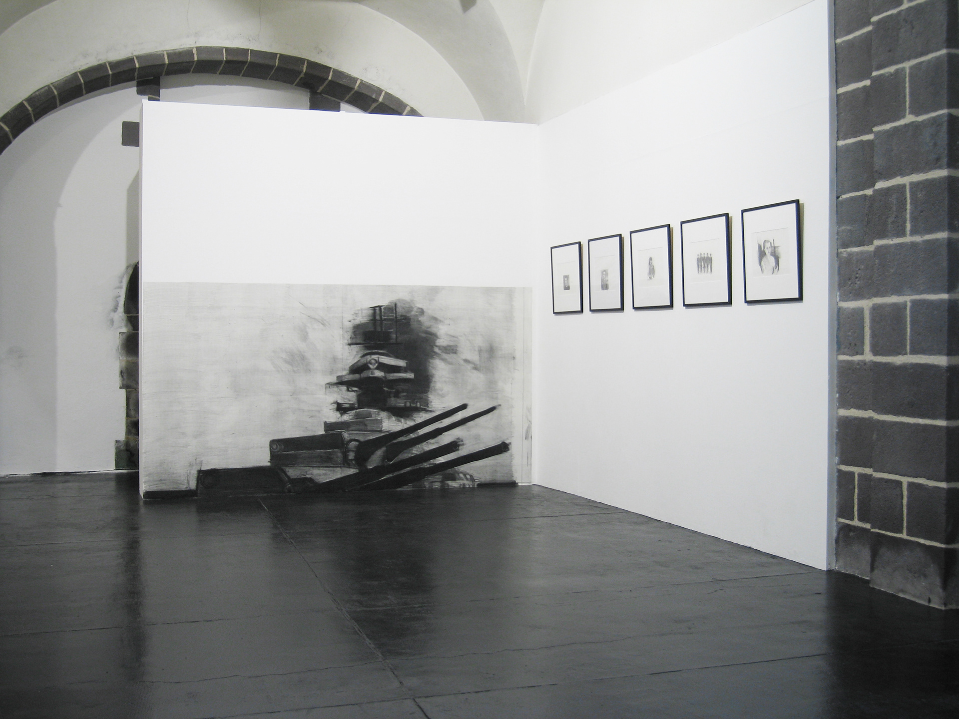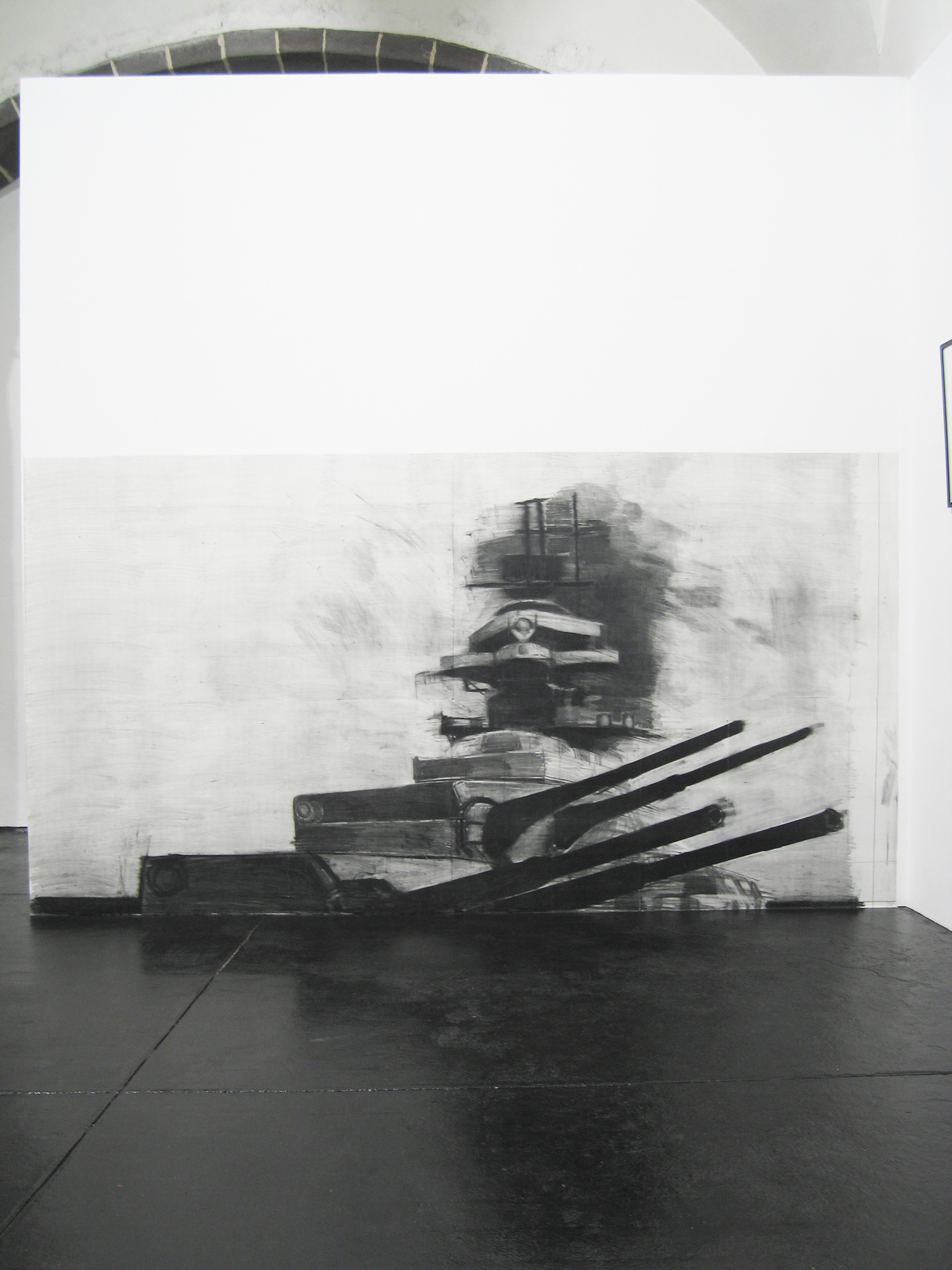 dizaines de dessins de petits formats auxquels s’ajoutent trois dessins de grandes dimensions et une impression murale monumentale représentant un navire de guerre. Axée sur l’idée de guerre et de destruction, prenant successivement appui sur les considérations sur le pouvoir développées par