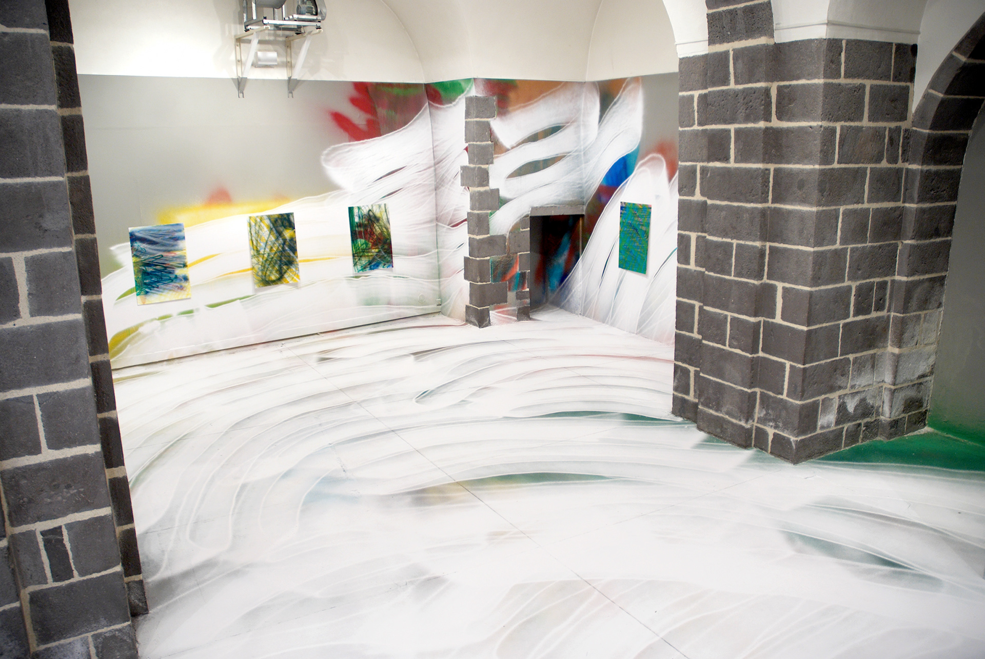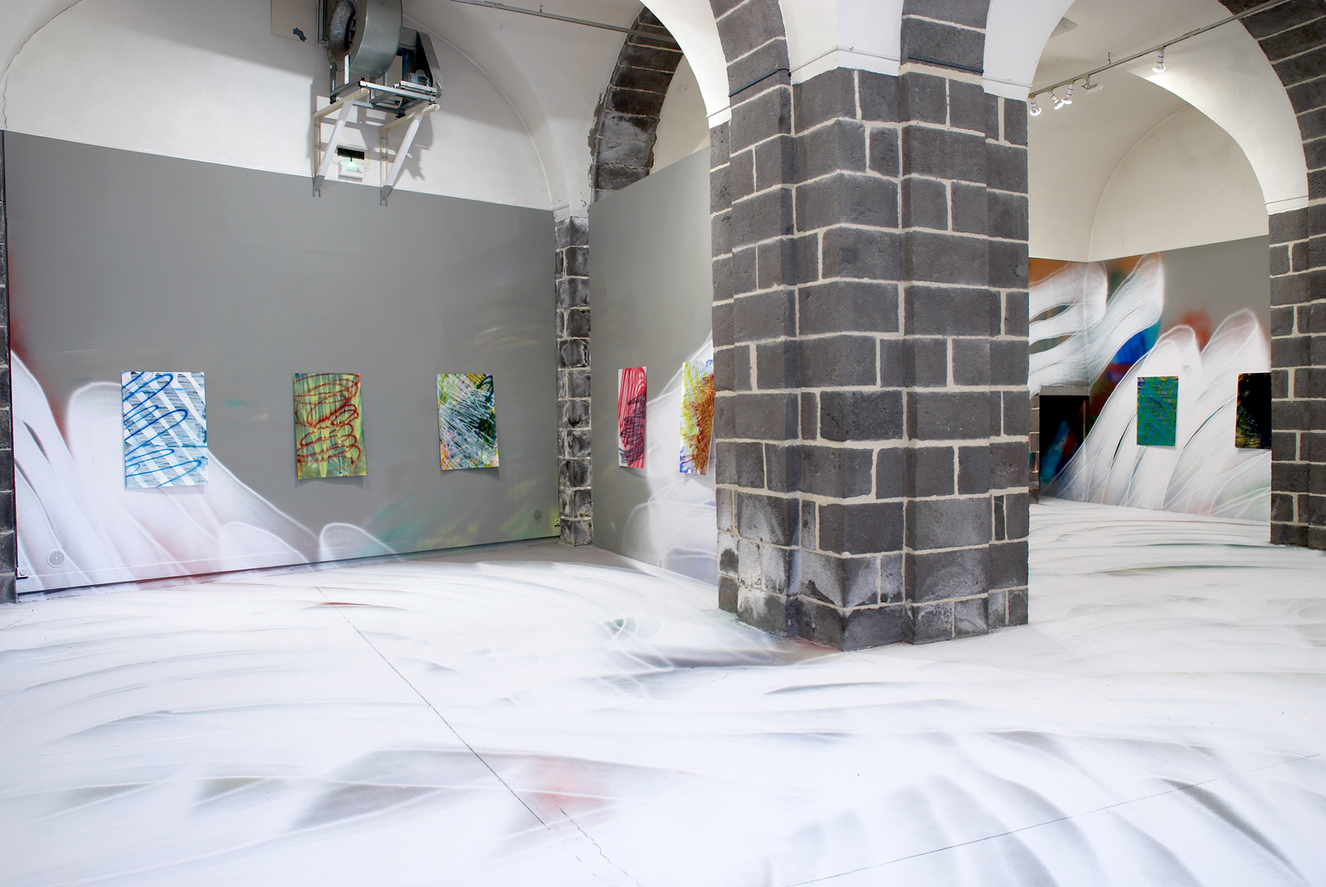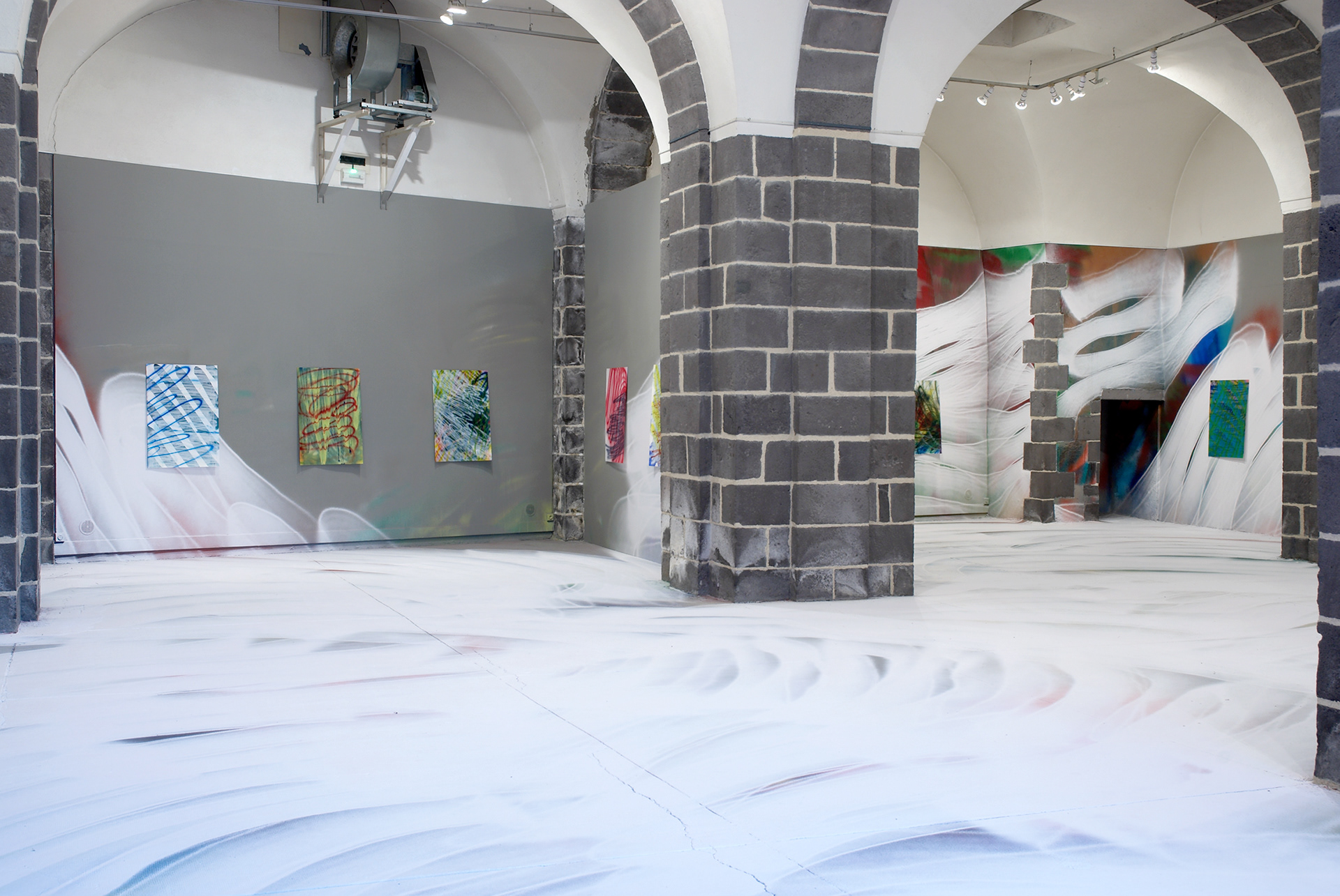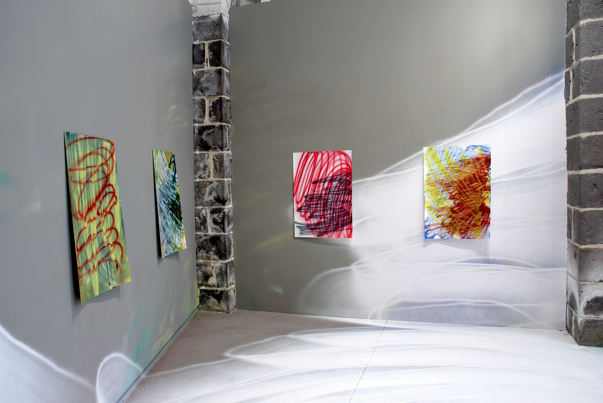 Dans un second temps, correspondant à une deuxième exposition titrée SKROW NO REPAP, l’environnement initialement créé a fait l’objet d’une destruction partielle en recouvrant du sol et une partie des murs par une couche pulvérisée de peinture blanche légèrement rosée. Le parti pris fut encore, mais d’une autre façon, de jouer sur une inversion spatiale en reportant sur le sol le blanc habituellement utilisé pour les cimaises. La deuxième étape a consisté à accrocher aux murs quelques dizaines de peintures sur papier de formats identiques, choisies à l’issue de la réalisation du projet The Flowershow. Le titre – SKROW NO REPAP – est l’écriture inversée de droite à gauche de « works on paper », ou de « paper on works ». Il souligne les principes essentiels qui parcourent le travail de Katharina Grosse : prise en compte particulière de la sphère grammaticale au sein d’une pratique picturale, retroussement de la langue et de l’espace, principe de réciprocité dans les échanges permanents entre œuvres « mobiles » et œuvres in situ… SKROW NO REPAP dit à la fois la rémanence d’un vocabulaire élaboré à l’atelier et l’incontournable connexion de ce champ lexical avec les extensions spatiales qu’il subit lorsqu’il se retrouve immergé dans une création in situ qui ne cesse de l’expérimenter, de le faire évoluer, de le nourrir.