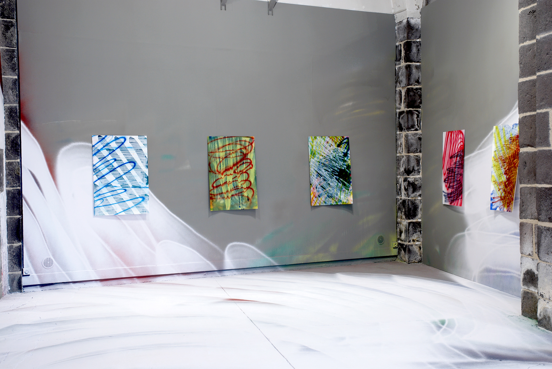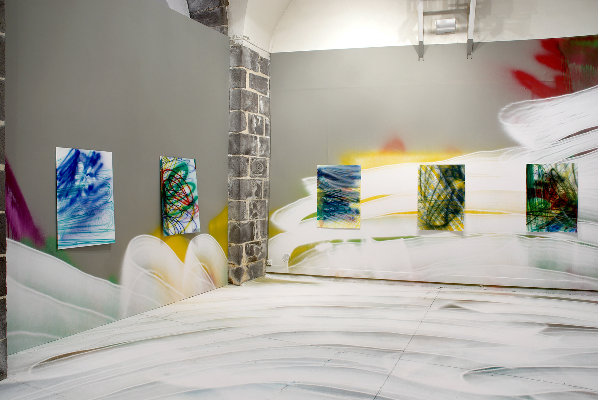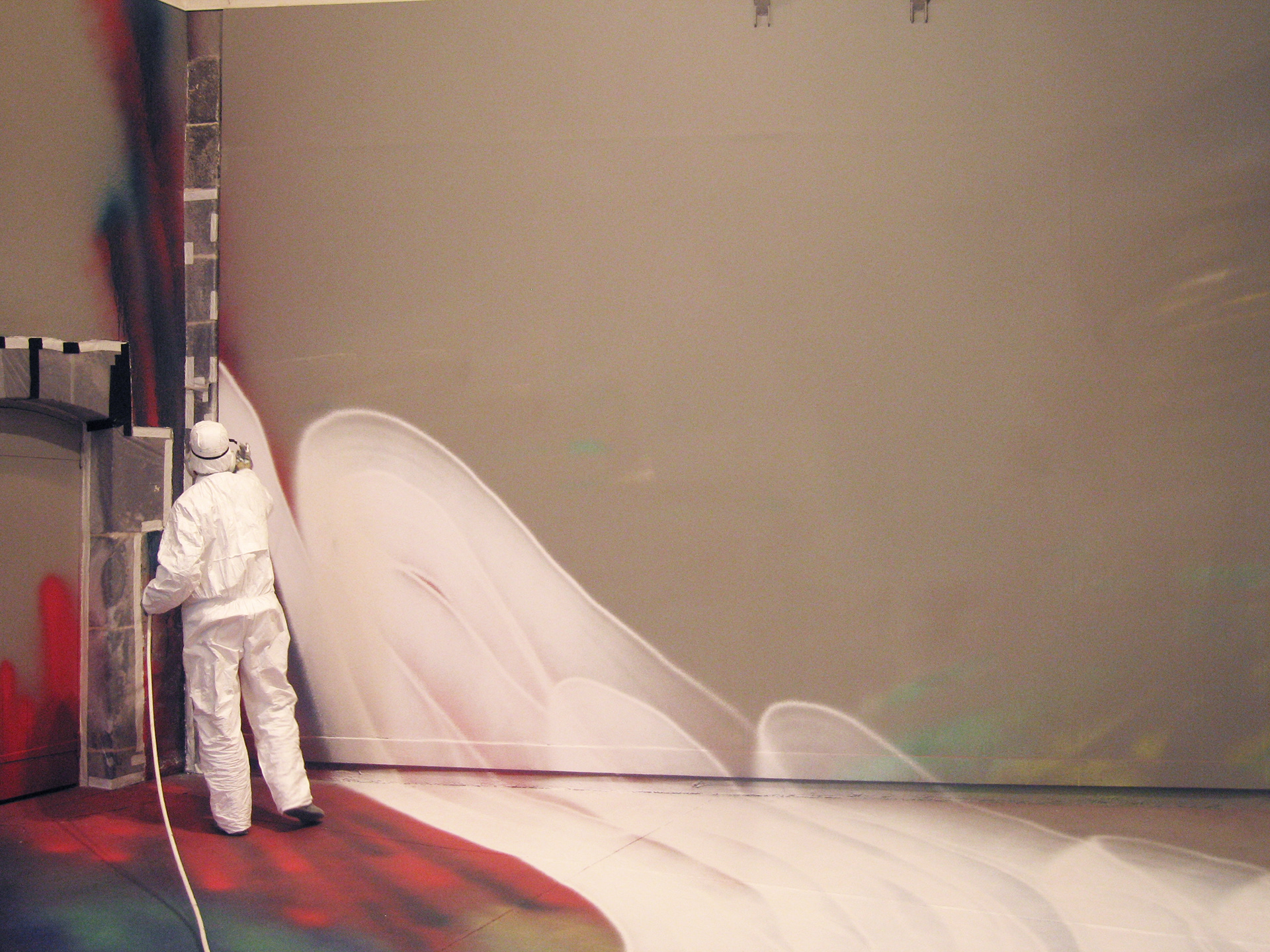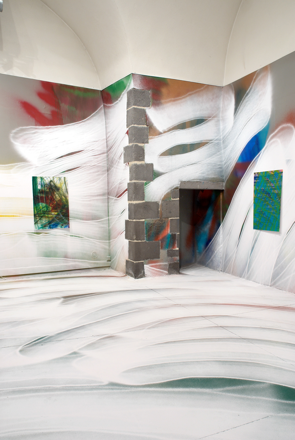 Dans un second temps, correspondant à une deuxième exposition titrée SKROW NO REPAP, l’environnement initialement créé a fait l’objet d’une destruction partielle en recouvrant du sol et une partie des murs par une couche pulvérisée de peinture blanche légèrement rosée. Le parti pris fut encore, mais d’une autre façon, de jouer sur une inversion spatiale en reportant sur le sol le blanc habituellement utilisé pour les cimaises. La deuxième étape a consisté à accrocher aux murs quelques dizaines de peintures sur papier de formats identiques, choisies à l’issue de la réalisation du projet The Flowershow. Le titre – SKROW NO REPAP – est l’écriture inversée de droite à gauche de « works on paper », ou de « paper on works ». Il souligne les principes essentiels qui parcourent le travail de Katharina Grosse : prise en compte particulière de la sphère grammaticale au sein d’une pratique picturale, retroussement de la langue et de l’espace, principe de réciprocité dans les échanges permanents entre œuvres « mobiles » et œuvres in situ… SKROW NO REPAP dit à la fois la rémanence d’un vocabulaire élaboré à l’atelier et l’incontournable connexion de ce champ lexical avec les extensions spatiales qu’il subit lorsqu’il se retrouve immergé dans une création in situ qui ne cesse de l’expérimenter, de le faire évoluer, de le nourrir.