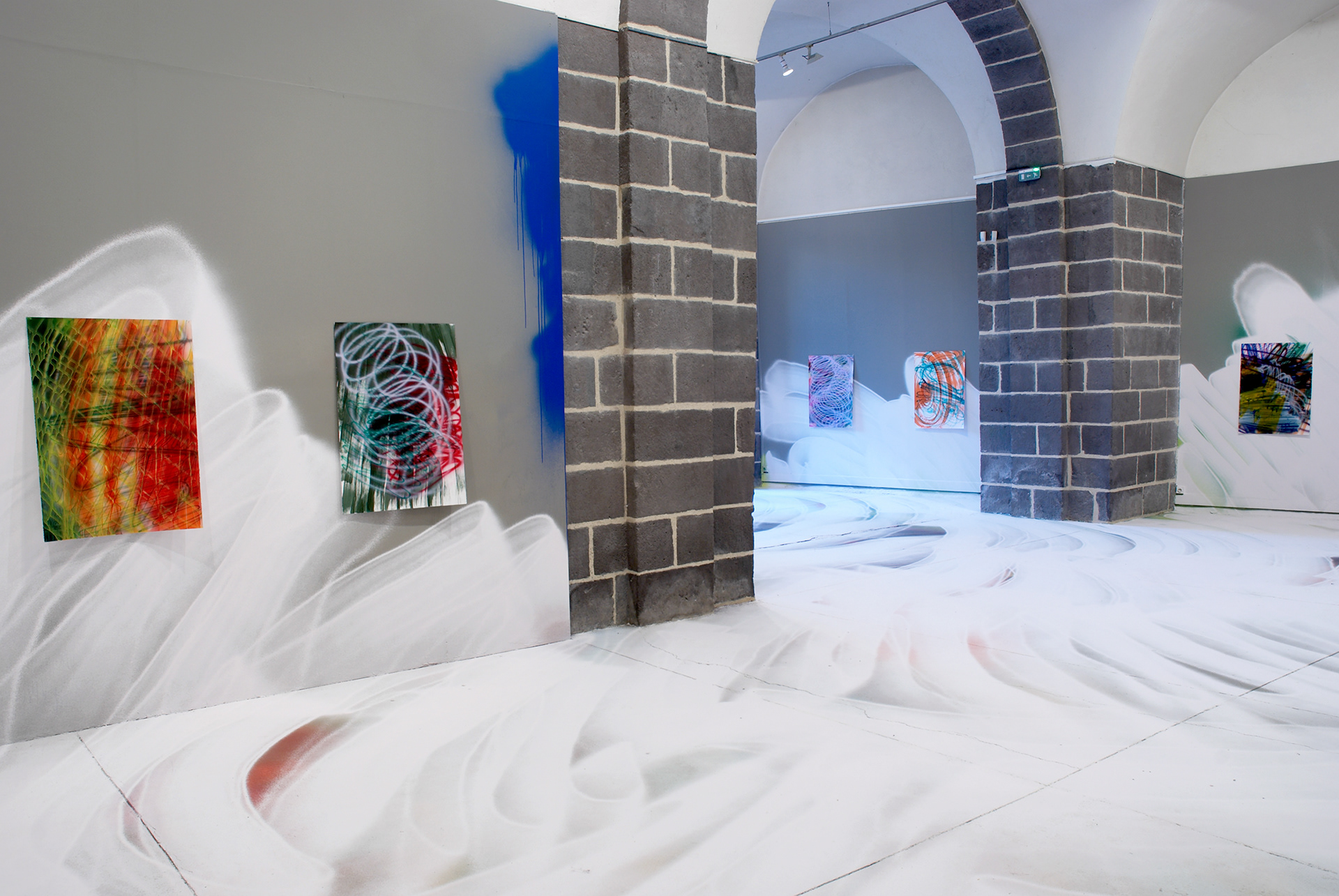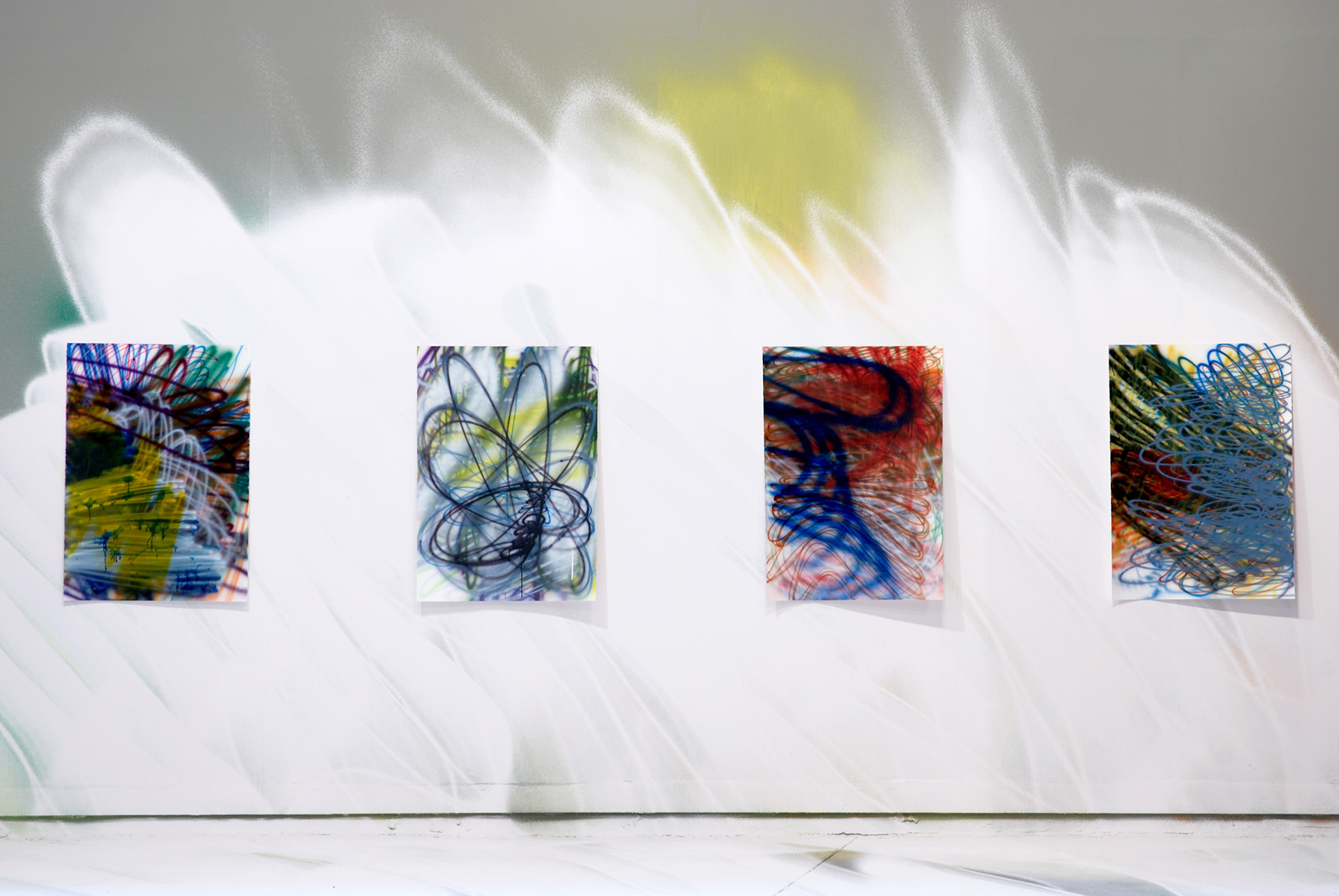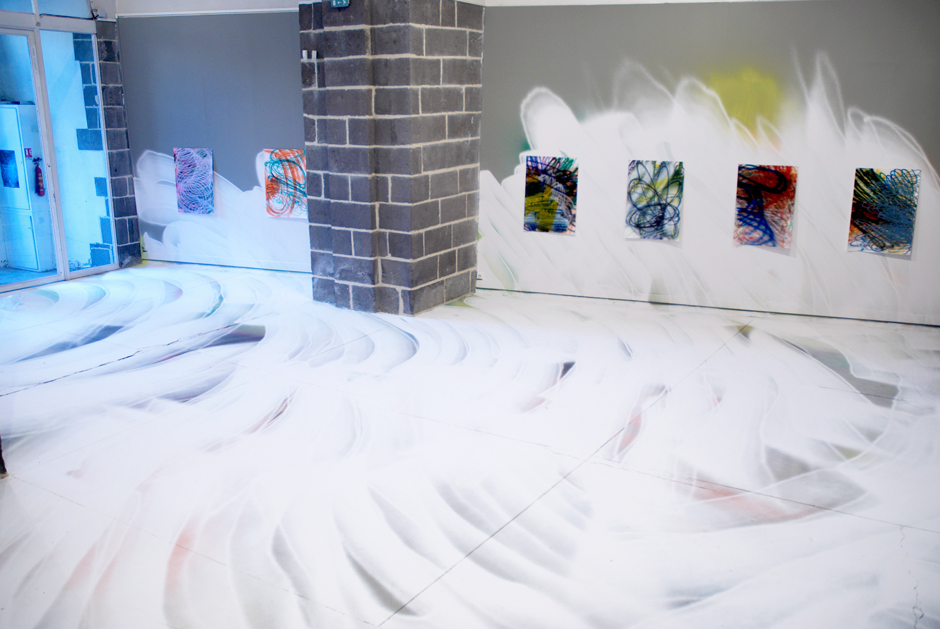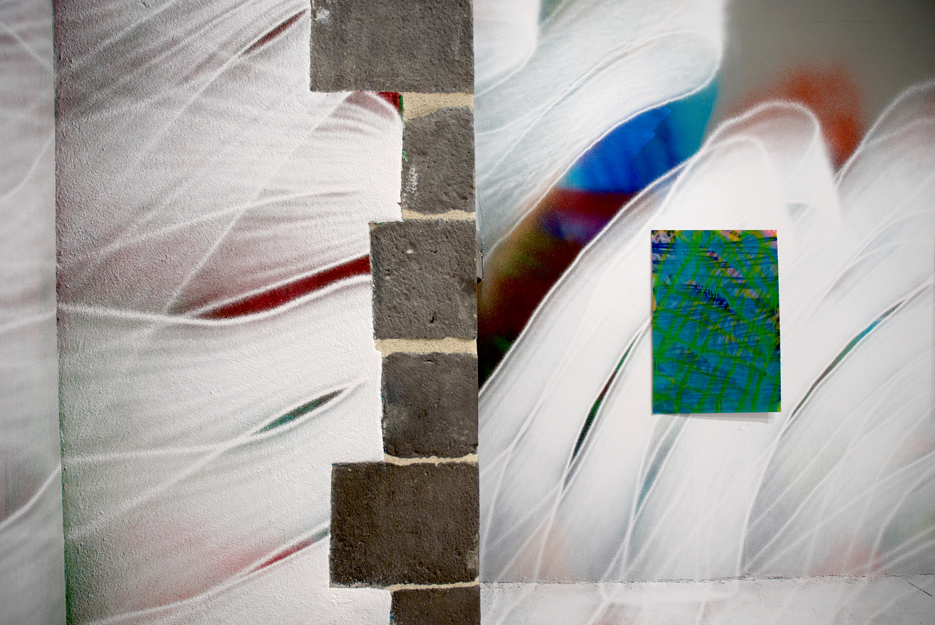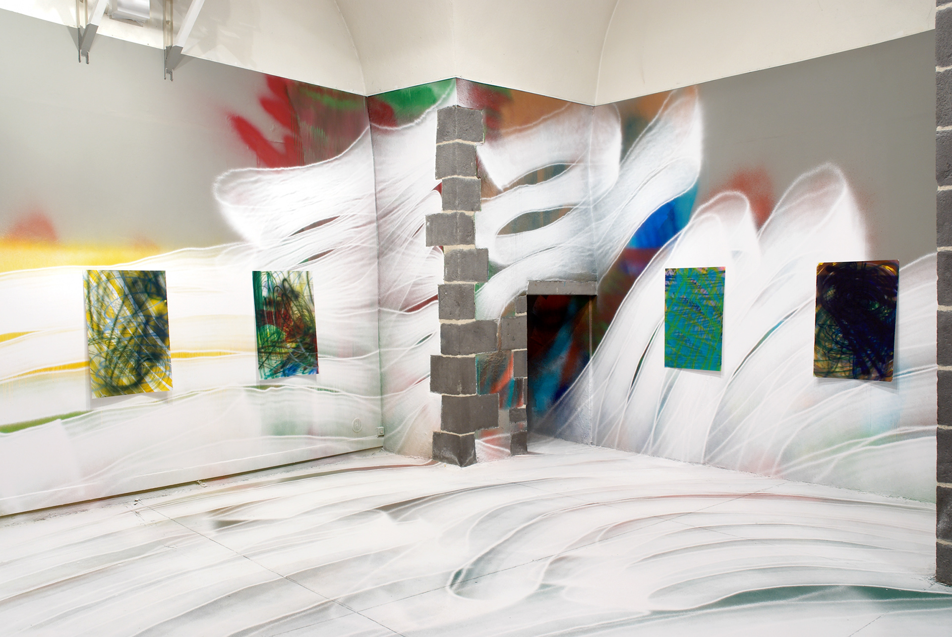 Dans un second temps, correspondant à une deuxième exposition titrée SKROW NO REPAP, l’environnement initialement créé a fait l’objet d’une destruction partielle en recouvrant du sol et une partie des murs par une couche pulvérisée de peinture blanche légèrement rosée. Le parti pris fut encore, mais d’une autre façon, de jouer sur une inversion spatiale en reportant sur le sol le blanc habituellement utilisé pour les cimaises. La deuxième étape a consisté à accrocher aux murs quelques dizaines de peintures sur papier de formats identiques, choisies à l’issue de la réalisation du projet The Flowershow. Le titre – SKROW NO REPAP – est l’écriture inversée de droite à gauche de « works on paper », ou de « paper on works ». Il souligne les principes essentiels qui parcourent le travail de Katharina Grosse : prise en compte particulière de la sphère grammaticale au sein d’une pratique picturale, retroussement de la langue et de l’espace, principe de réciprocité dans les échanges permanents entre œuvres « mobiles » et œuvres in situ… SKROW NO REPAP dit à la fois la rémanence d’un vocabulaire élaboré à l’atelier et l’incontournable connexion de ce champ lexical avec les extensions spatiales qu’il subit lorsqu’il se retrouve immergé dans une création in situ qui ne cesse de l’expérimenter, de le faire évoluer, de le nourrir.