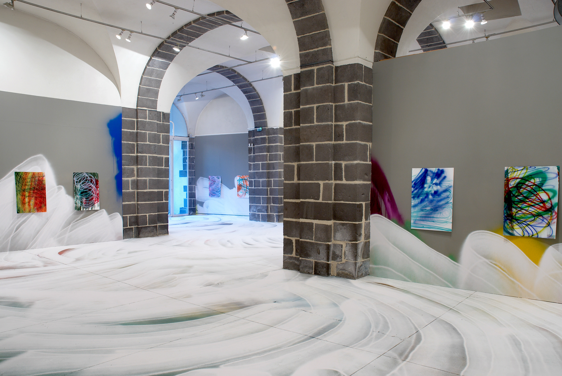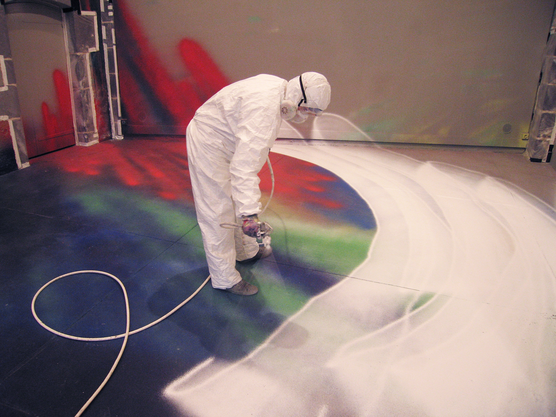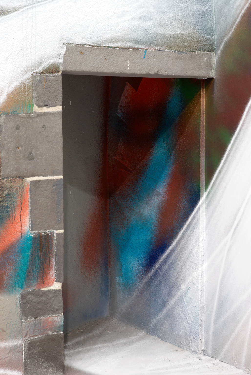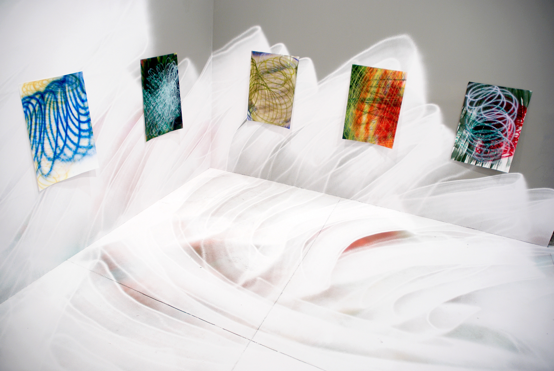 Dans un second temps, correspondant à une deuxième exposition titrée SKROW NO REPAP, l’environnement initialement créé a fait l’objet d’une destruction partielle en recouvrant du sol et une partie des murs par une couche pulvérisée de peinture blanche légèrement rosée. Le parti pris fut encore, mais d’une autre façon, de jouer sur une inversion spatiale en reportant sur le sol le blanc habituellement utilisé pour les cimaises. La deuxième étape a consisté à accrocher aux murs quelques dizaines de peintures sur papier de formats identiques, choisies à l’issue de la réalisation du projet The Flowershow. Le titre – SKROW NO REPAP – est l’écriture inversée de droite à gauche de « works on paper », ou de « paper on works ». Il souligne les principes essentiels qui parcourent le travail de Katharina Grosse : prise en compte particulière de la sphère grammaticale au sein d’une pratique picturale, retroussement de la langue et de l’espace, principe de réciprocité dans les échanges permanents entre œuvres « mobiles » et œuvres in situ… SKROW NO REPAP dit à la fois la rémanence d’un vocabulaire élaboré à l’atelier et l’incontournable connexion de ce champ lexical avec les extensions spatiales qu’il subit lorsqu’il se retrouve immergé dans une création in situ qui ne cesse de l’expérimenter, de le faire évoluer, de le nourrir.
