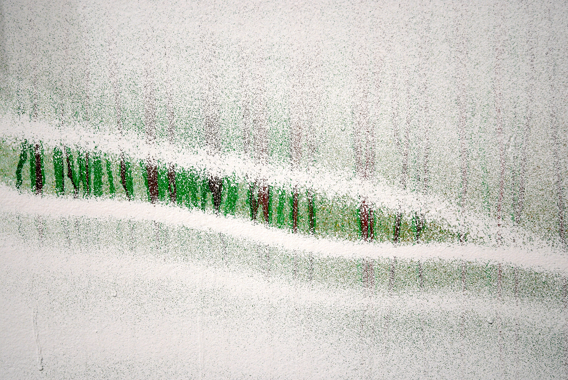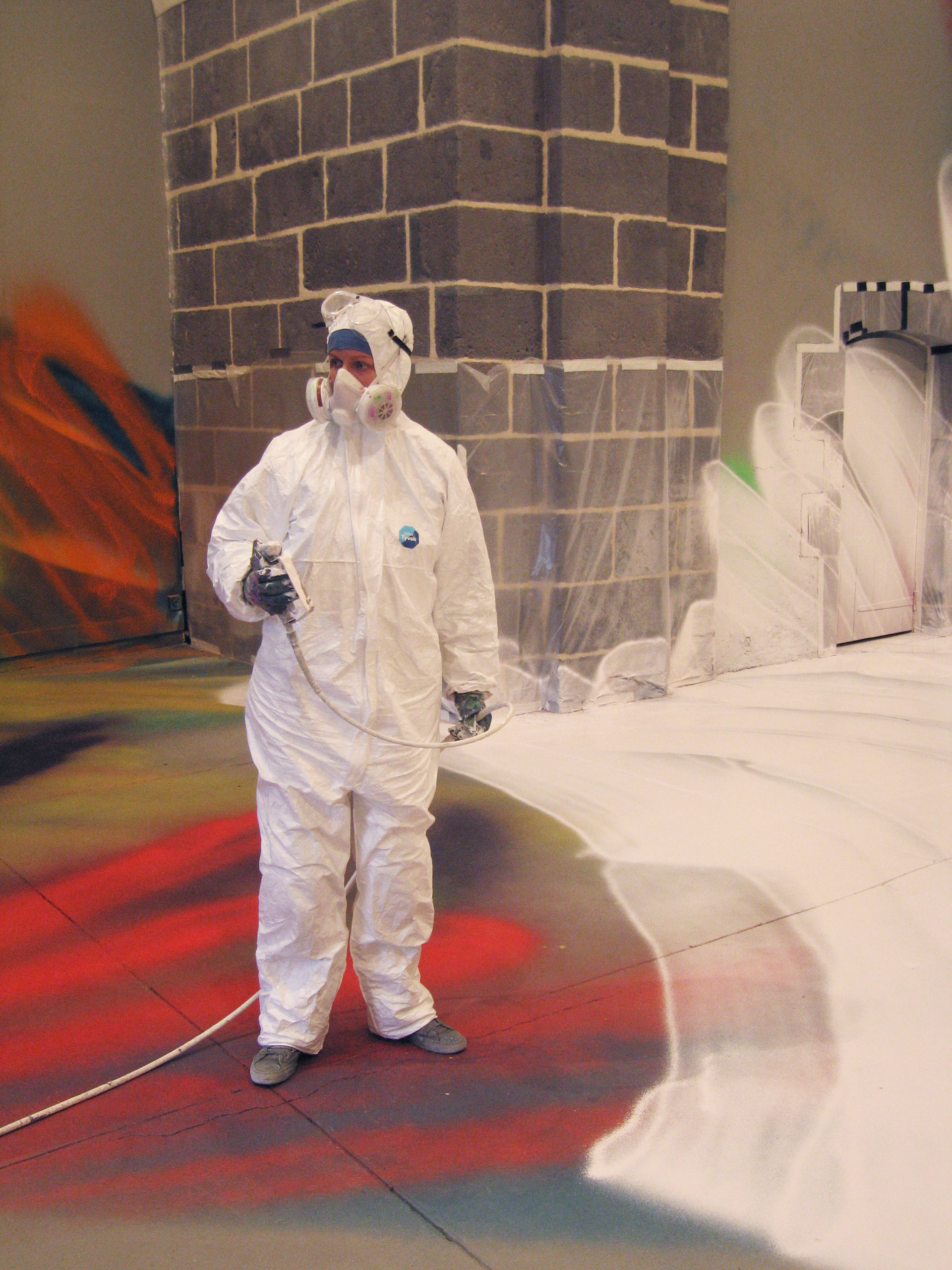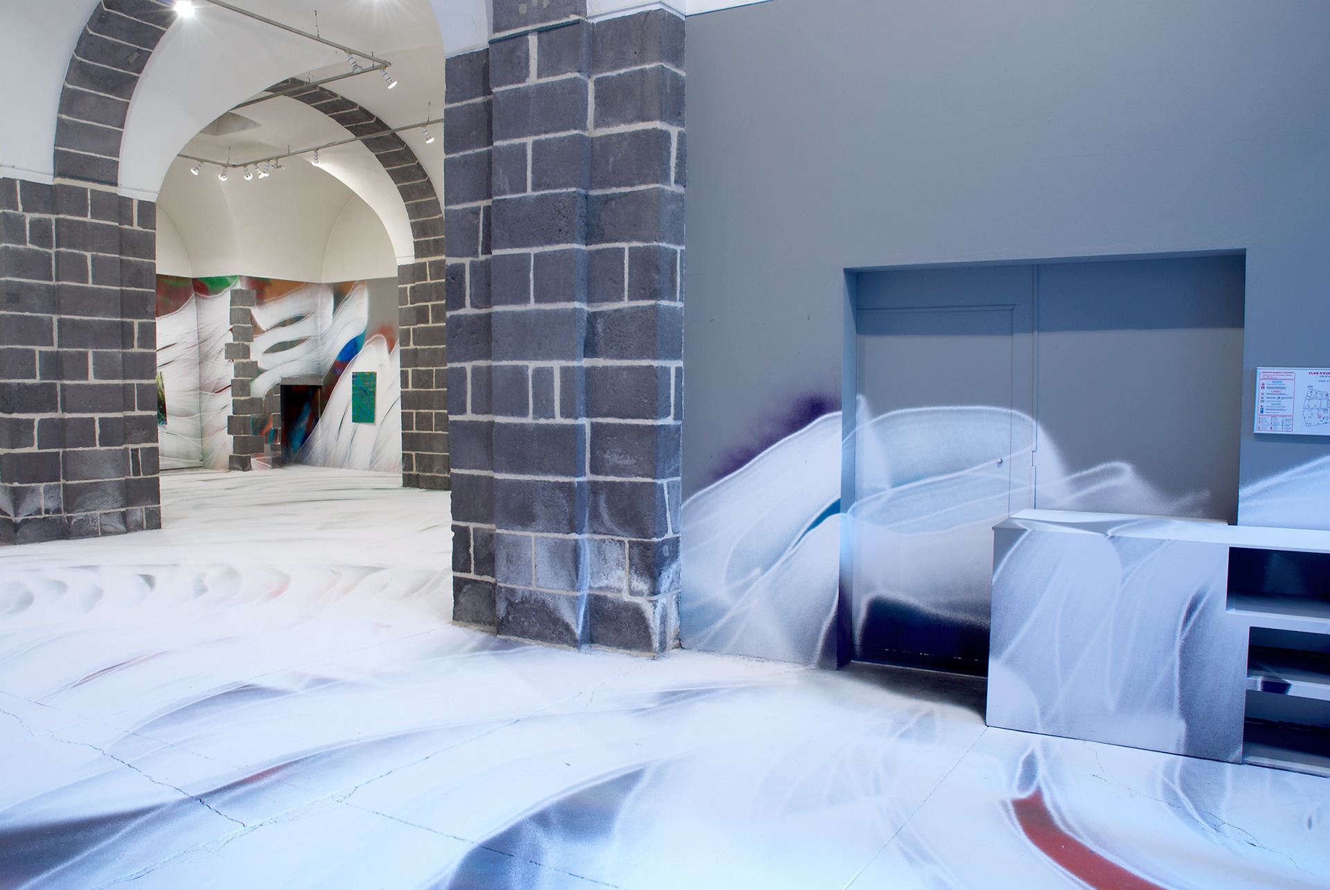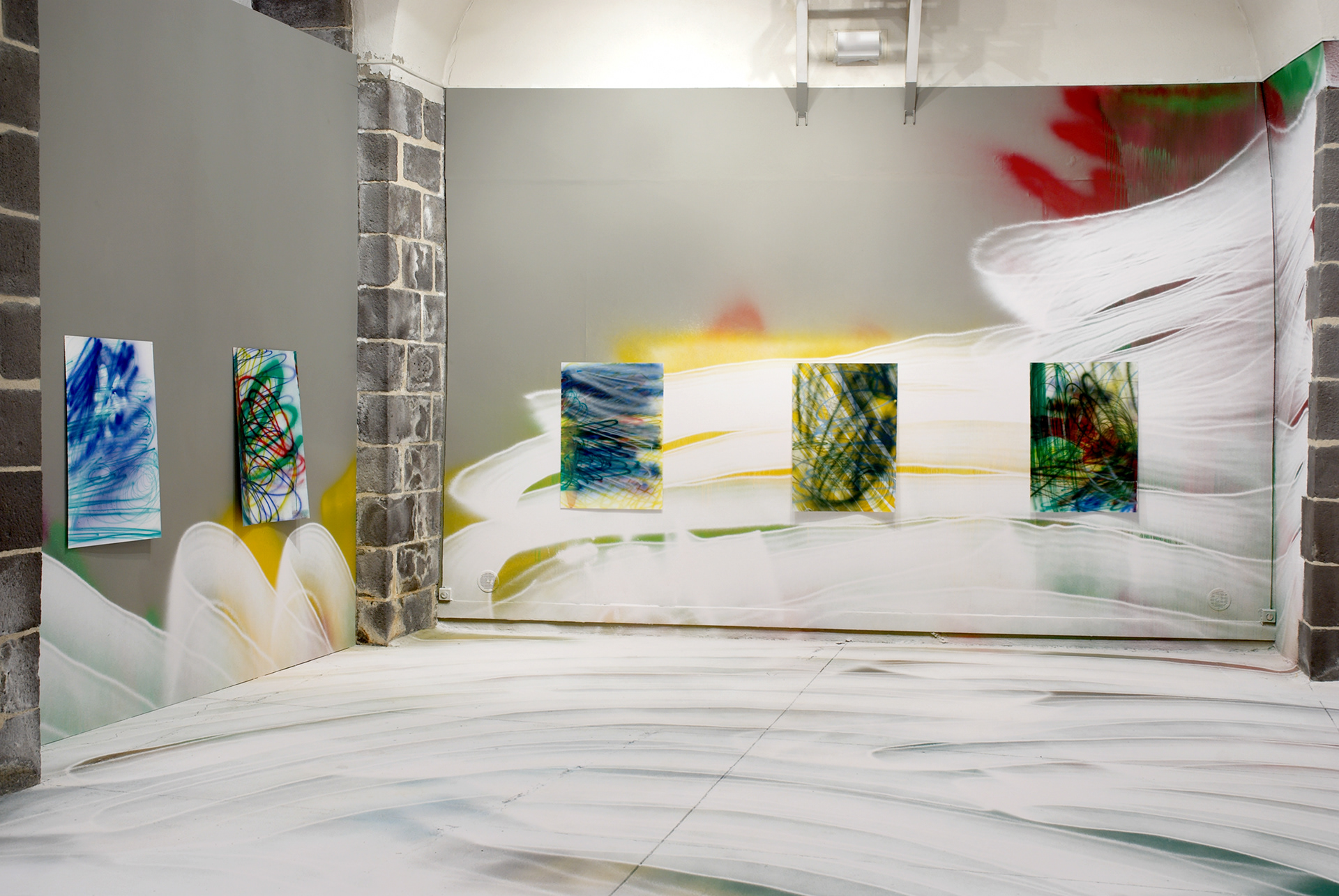 Dans un second temps, correspondant à une deuxième exposition titrée SKROW NO REPAP, l’environnement initialement créé a fait l’objet d’une destruction partielle en recouvrant du sol et une partie des murs par une couche pulvérisée de peinture blanche légèrement rosée. Le parti pris fut encore, mais d’une autre façon, de jouer sur une inversion spatiale en reportant sur le sol le blanc habituellement utilisé pour les cimaises. La deuxième étape a consisté à accrocher aux murs quelques dizaines de peintures sur papier de formats identiques, choisies à l’issue de la réalisation du projet The Flowershow. Le titre – SKROW NO REPAP – est l’écriture inversée de droite à gauche de « works on paper », ou de « paper on works ». Il souligne les principes essentiels qui parcourent le travail de Katharina Grosse : prise en compte particulière de la sphère grammaticale au sein d’une pratique picturale, retroussement de la langue et de l’espace, principe de réciprocité dans les échanges permanents entre œuvres « mobiles » et œuvres in situ… SKROW NO REPAP dit à la fois la rémanence d’un vocabulaire élaboré à l’atelier et l’incontournable connexion de ce champ lexical avec les extensions spatiales qu’il subit lorsqu’il se retrouve immergé dans une création in situ qui ne cesse de l’expérimenter, de le faire évoluer, de le nourrir.