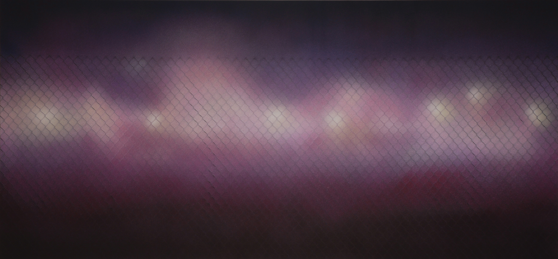 Réalisées par pulvérisation de fines particules de peintures sur une toile acrylique sans qu’aucune trace de pinceau ne soit jamais visible, les peintures donnent à voir de vastes nébuleuses photoniques et immatérielles généralement posées sur un fond mat très sombre qui absorbe la lumière comme le ferait un trou noir. On ne parvient pas à savoir si ces luminescences gazeuses sont en expansion ou en contraction, on les imagine tout autant fixes que mues par une célérité dont le degré lui-même reste immesurable. Les lumières irradiantes de la série Zone vues au travers de grillages ne disent pas si elles sont des explosions ou des éclairages fixes dont les propriétés atmosphériques seraient une conséquence d’ordre climatique. Ce principe d’incertitude constitue probablement le cœur du travail de Nicolas Delprat et les peintures n’ont finalement de cesse d’interroger notre capacité à voir avec exactitude et, surtout, à se souvenir avec précision des choses vues.