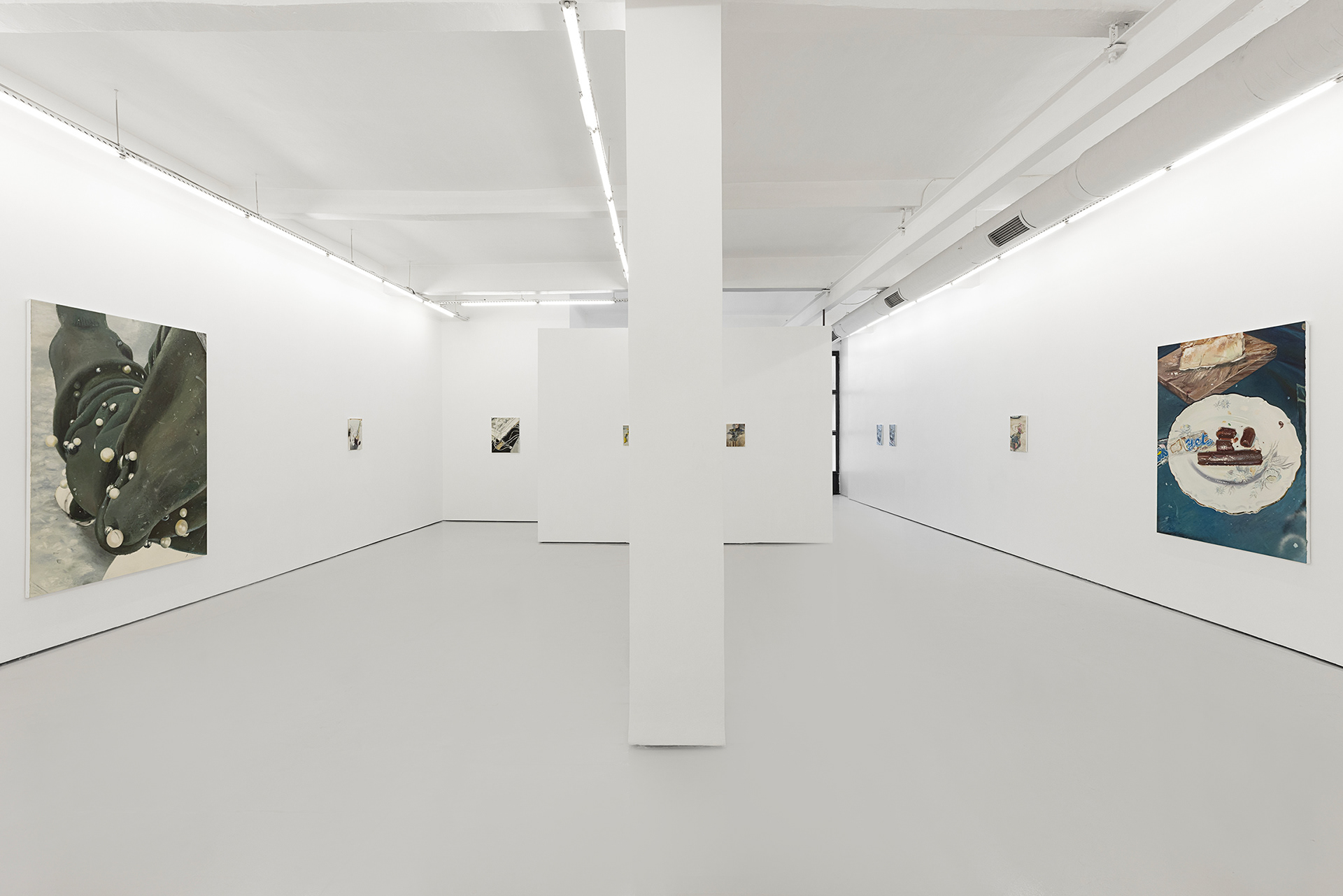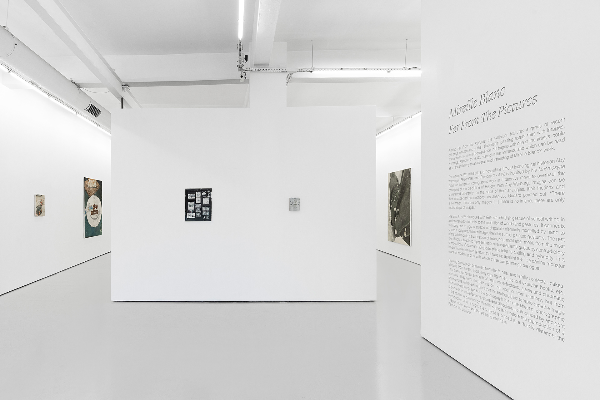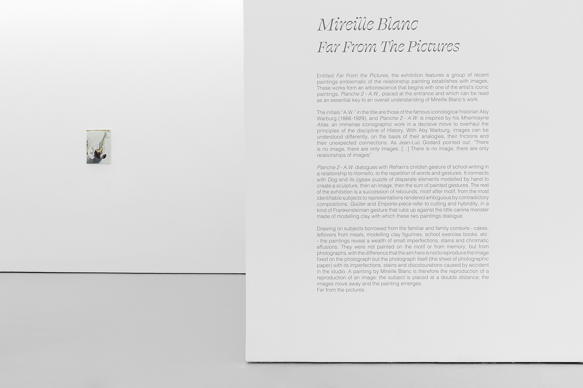 Planche 2 – A.W. ouvre et referme l’exposition de Mireille Blanc. Le choix de cette peinture iconique au sein de son œuvre donne une clé essentielle pour appréhender l’ensemble de sa pratique. Planche 2 – A.W. n’est pas la représentation de la planche de l’Atlas Mnémosyne mais la représentation d’une photographie de cette planche elle-même constituée par un assemblage de photographies. Les images disparates qui composent la planche de Mnémosyne se trouvent ainsi unifiées en une image unique. C’est là une belle synthèse du risque d’anachronisme auquel nous sommes soumis lorsque nous regardons vers le passé, toujours perçu du point de vue d’un présent opérant une diffraction optique doublée d’un trouble. Le symptôme est là, dans la perte progressive de définition des images au fil de leurs transpositions pour que ne demeure au final que des gestes de peinture habités par le retour fantomatique de tous les gestes picturaux de l’histoire de l’art. Placée à l’entrée et à la sortie de l’exposition, Planche 2 – A.W. ouvre et referme une arborescence de tableaux aux motifs interconnectés, révélant leur gestes selon un processus iconologique semblable à celui d’Aby Warburg pour la composition de ses planches. Planche 2 – A.W. dialogue avec le geste enfantin d’écriture scolaire de Refrain dans une relation à la ritournelle, à la répétition des mots, des gestes et des images. Finalement, les images sont sommées de battre en retraite pour laisser le champ libre à la peinture. Far from the pictures.