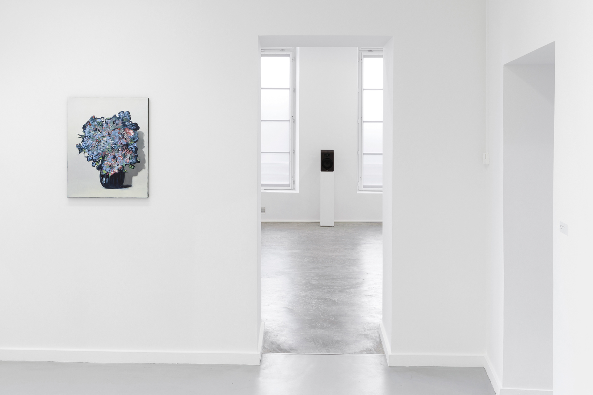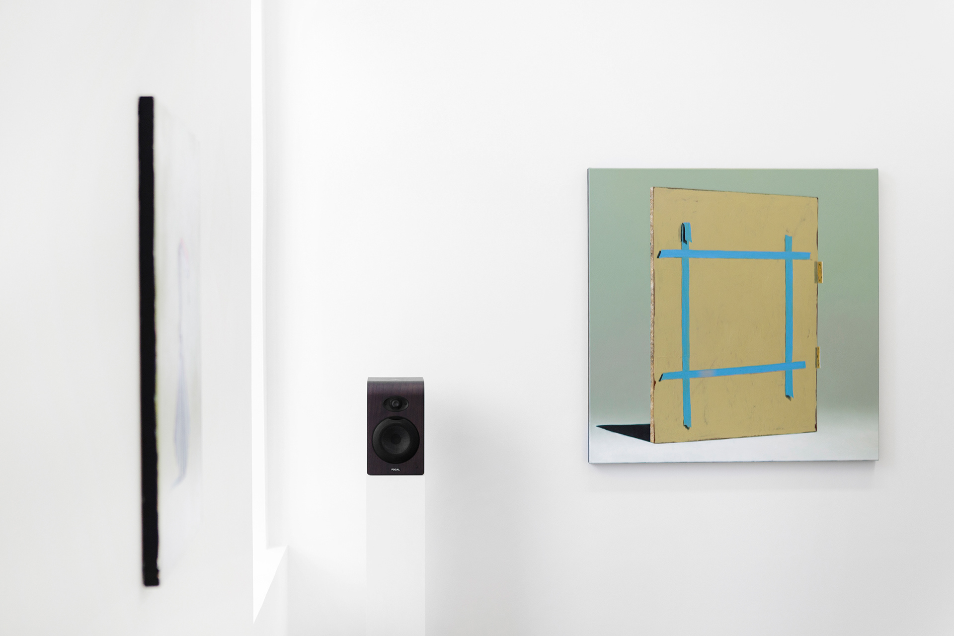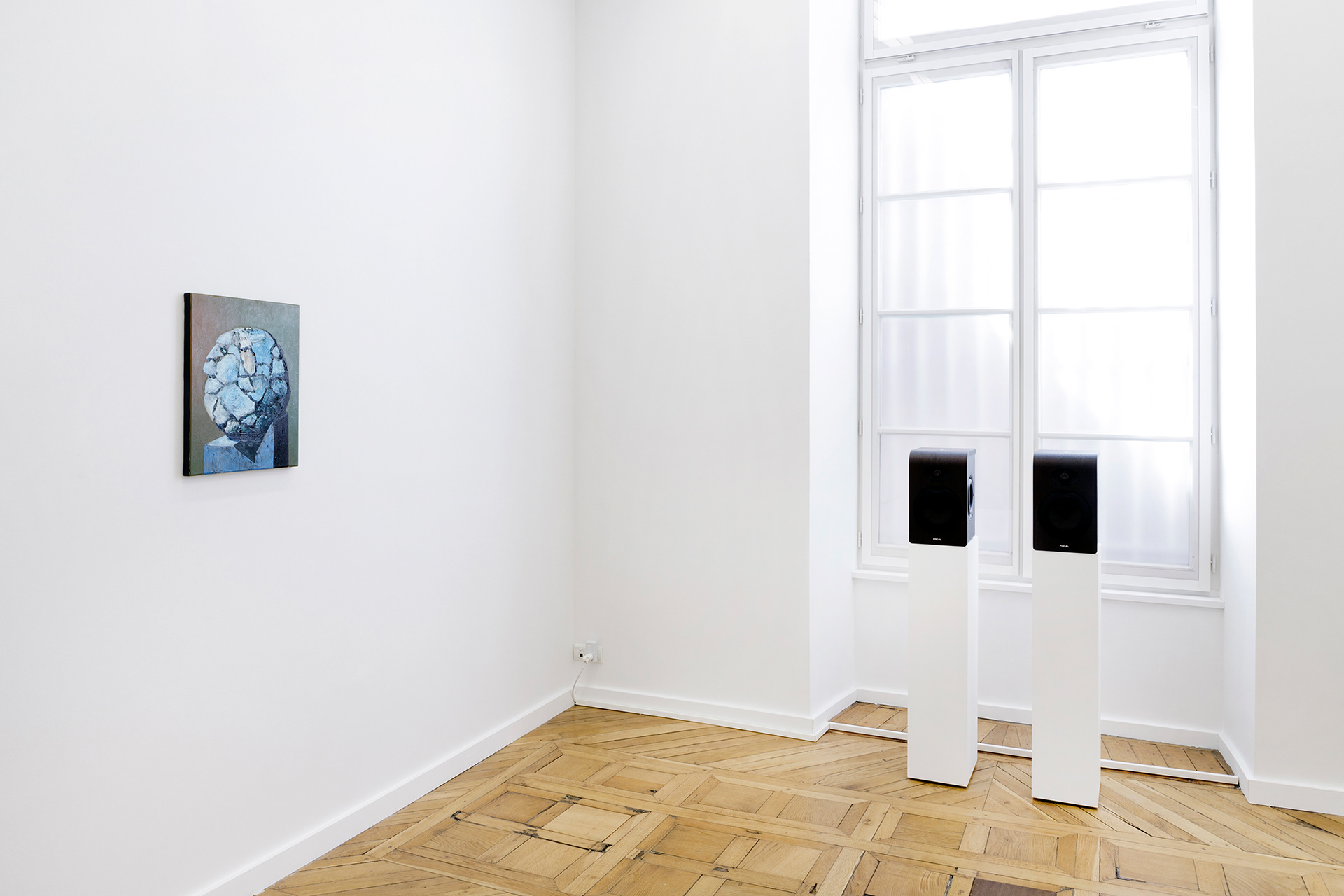 manuscrit posé à la verticale dans un espace indéterminé, un fond peint en un aplat dégradé allant du bleu charron au vert sauge à peine teinté de rouge, un vert assimilable à un sol en raison de l’ombre portée produite par le rouleau de papier. Ni abstraction, ni figuration, c’est en premier lieu cette peinture qui m’incita à lire la critique et, surtout, à écouter le titre disponible à l’écoute, intitulé Things that are beautiful and transient.