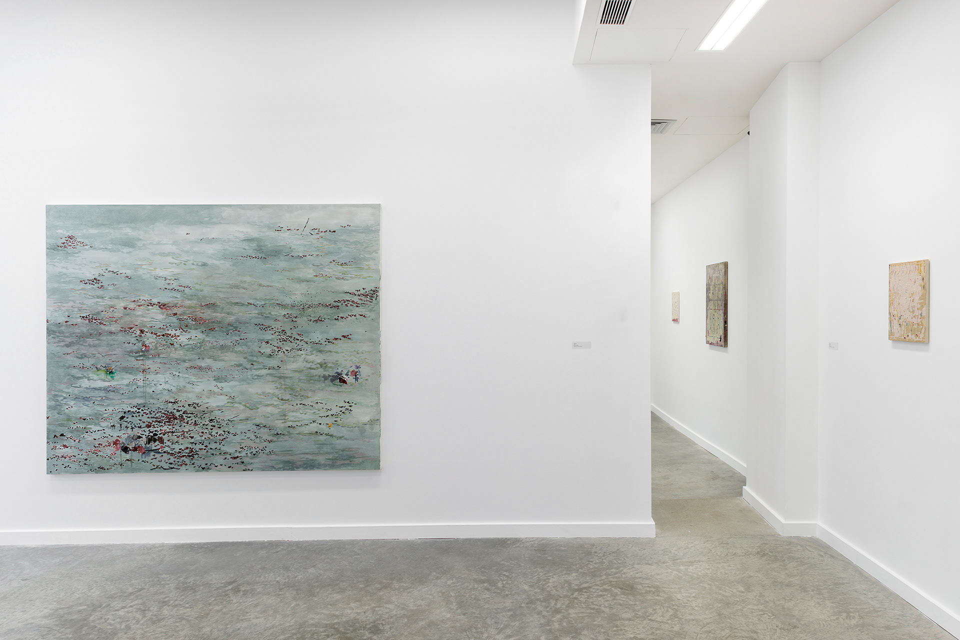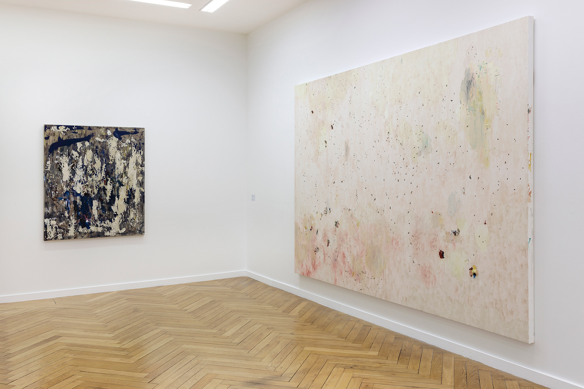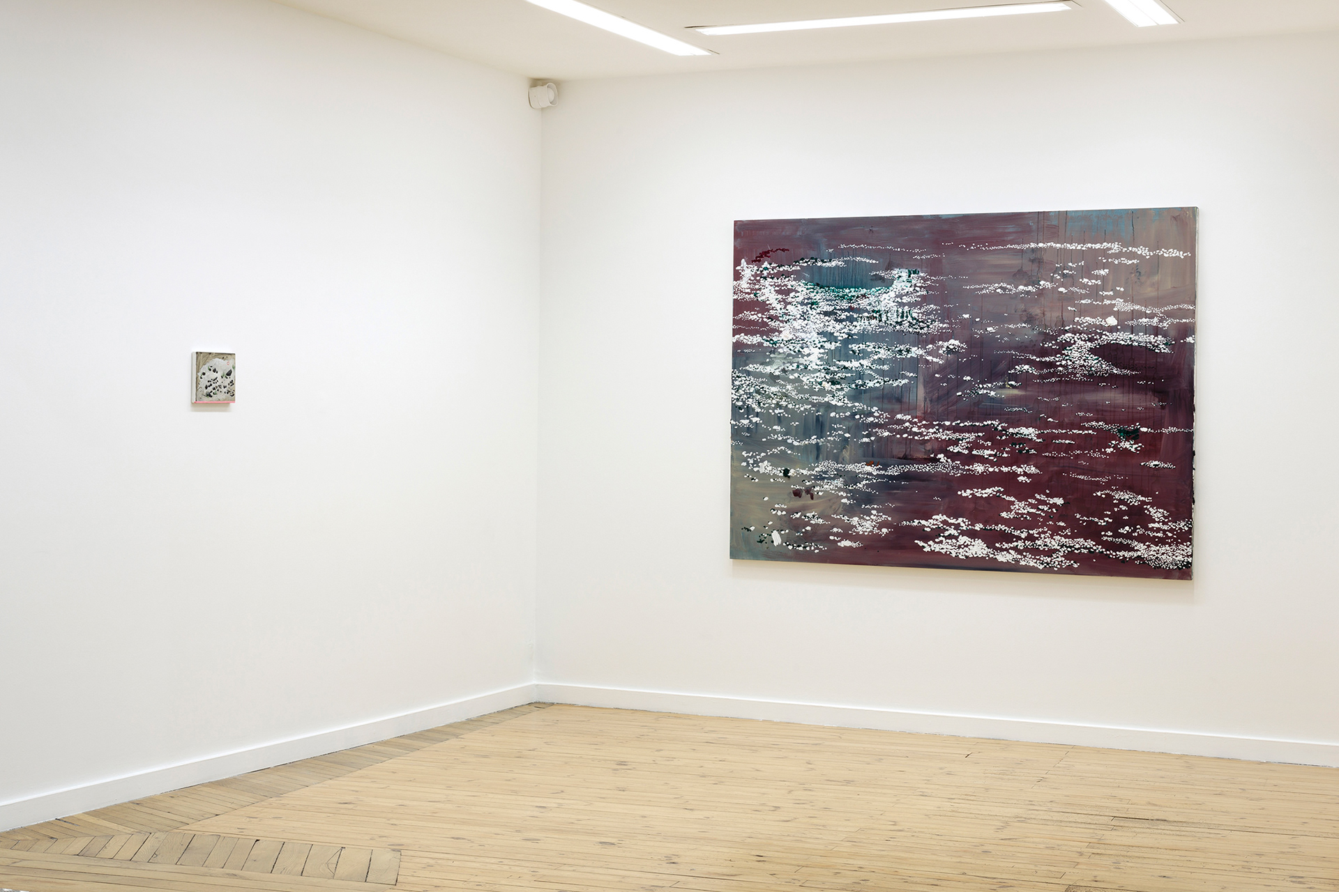 Arrêté sans être fixé, c’est ainsi que pourrait être nommé le régime du regard happé par ces surfaces parfois vastes, toujours glissantes, toujours glissantes mais scandées par la pulvérulence des motifs, par leur éparpillement en nuées, motifs en nuées mais suffisamment agglomérés et prégnants pour arrêter le regard, sans le fixer. Le regard est arrêté, passé par le crible d’un champ chromatique dénué de perspective, le regard est arrêté sans être fixé dans le sublime d’un espace sans limites ni horizon, criblé de motifs épars qui piègent la vision en lui impulsant immédiatement ses déplacements suivants. Blocage et échappée, tout à la fois.