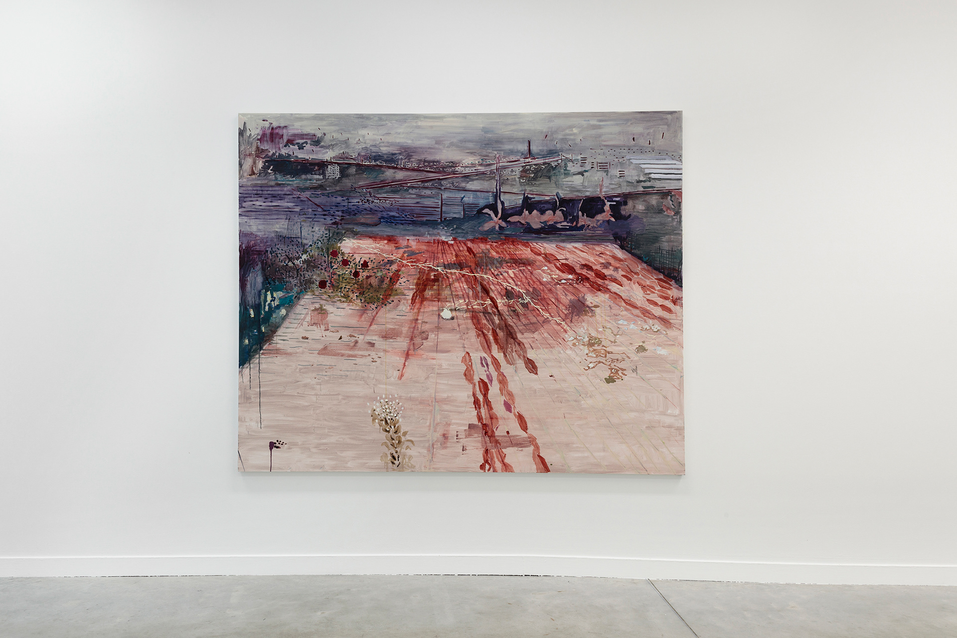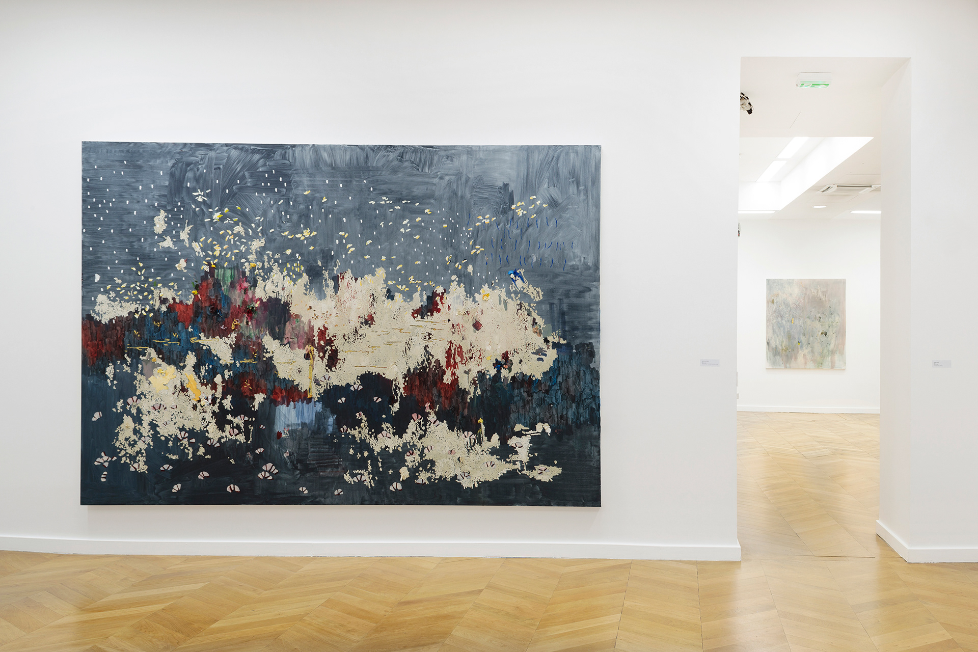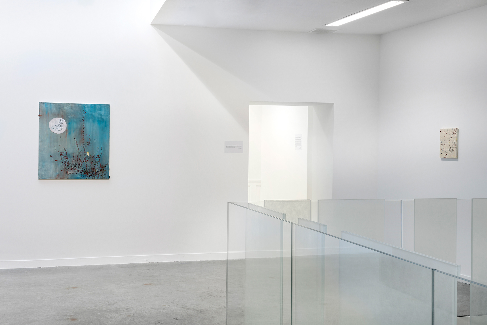 Les peintures et les broderies de Marina Rheingantz se nourrissent de la remémoration des paysages brésiliens, des souvenirs de la compacité de la terre, de la lumière et de ses variations, du nébuleux atmosphérique des crépuscules, de la dissémination pointilliste des oiseaux dans le ciel, du surgissement en grappes de fleurs et d’arbustes, de monticules émergés à la surface des plaines inondées… En regardant ses peintures pour la première fois, quelques mots se sont manifestés avec entêtement. Les premiers furent arrêté sans être fixé, pour qualifier la manière dont cette peinture oblige à une mise à l’arrêt du regard, une mise à l’arrêt simultanément contrariée par l’écarquillement visuel impulsé par le feuilletage de plans et de motifs, par les plongées aériennes d’étendues sans horizon parsemées de motifs en suspension, d’agglomérats de lumière, de poussières, de phosphènes, de nuées d’éphémères microscopiques, pailletées de particules de réel figées en apparence et pourtant toujours mouvantes. Le regard est mis aux arrêts, littéralement mis en détention, stoppé dans son arpentage par la résistance de la peinture, par la compacité de sa surface, par la trame de motifs et de signes qui en parsèment les aires et s’y superposent comme des filtres ajourés. Le regard est à l’arrêt, sans être fixé – à l’arrêt comme un animal se met à l’arrêt, toujours en puissance de mouvement prompt, toujours aux aguets.
