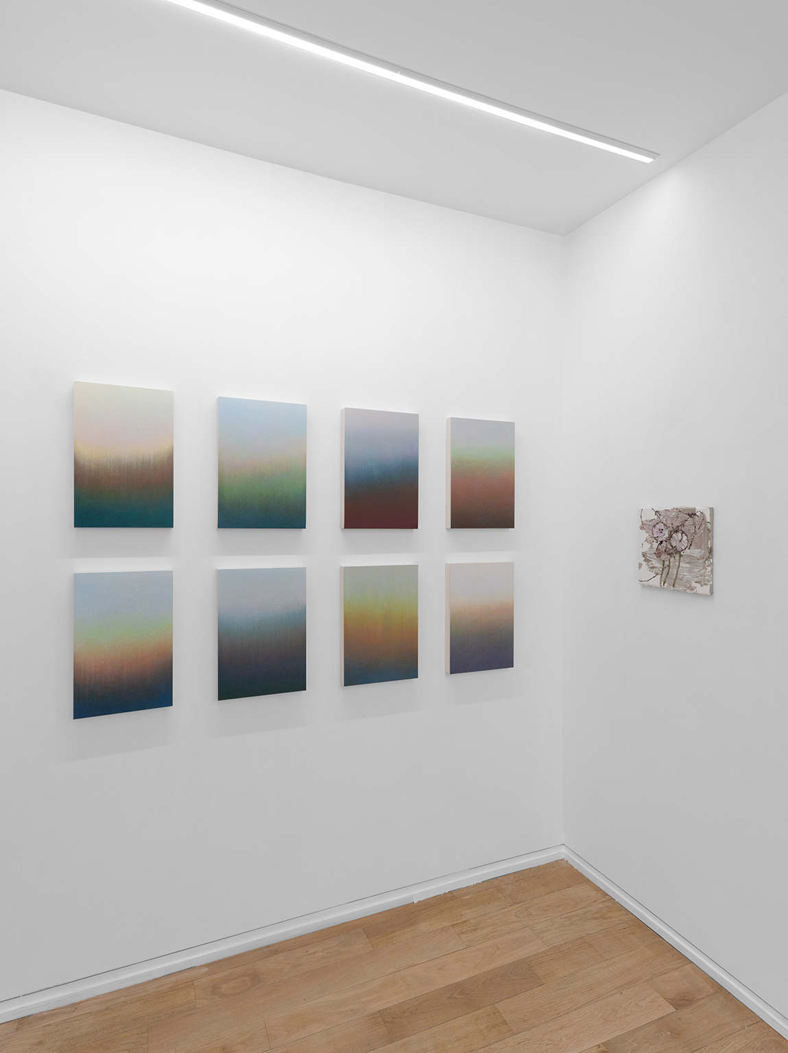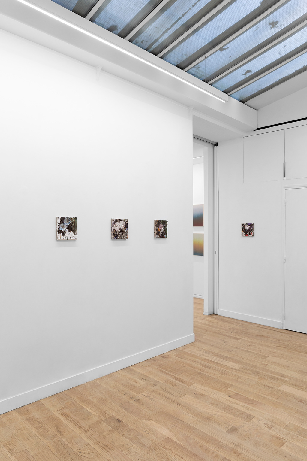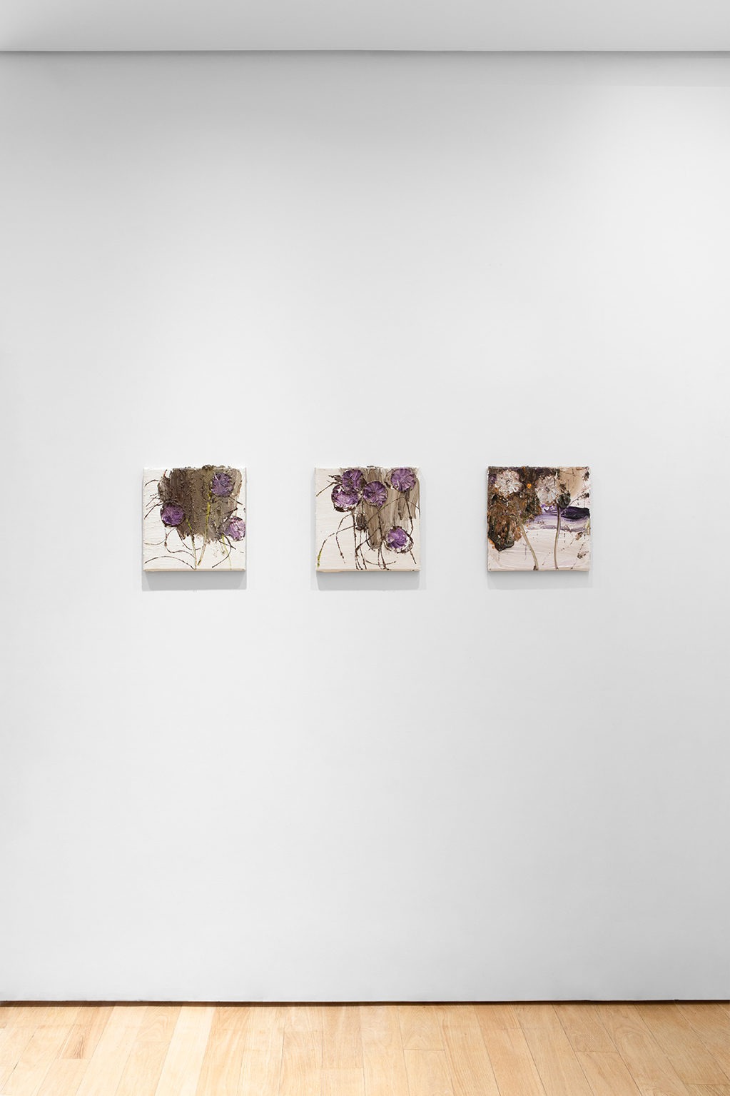 Imaginer un dialogue entre les deux artistes ne relève pas de l’évidence tant les deux pratiques s’établissent sur des territoires formels distants. Les réunir dans une exposition procède davantage de la friction que du rapprochement naturel. Claire Chesnier utilise l’encre pour ses peintures de grands formats dont les dimensions et la verticalité correspondent peu ou prou à celles de son corps. Denis Laget peint des tableautins dont les séries récentes occupent des formats carrés aux mesures à peine plus grandes que celles d’une main déployée. La surface des peintures sur papier de Claire Chesnier est lisse, sans accident, précautionneusement circonscrite par ses bords, eux-mêmes contenus dans un cadre – rien ne demeure jamais du débord, rien ne laisse entrevoir le commencement ni la fin du geste. À l’inverse, Denis Laget peint de manière organique et croûteuse, généralement à partir d’une toile sur châssis ayant été préalablement utilisée comme palette pour la peinture précédente. Ses tableaux sont des corps suintants, la matière malaxée par la brosse indique chaque geste et, pourtant, la somme des gestes opère un brouillage tel qu’il paraît improbable qu’une fleur, une feuille de figuier ou un crâne aient pu se révéler depuis ce miasme pictural pour s’extirper de leur gangue et se constituer en motifs. Pour les deux peintres, le risque de la boue est celui de